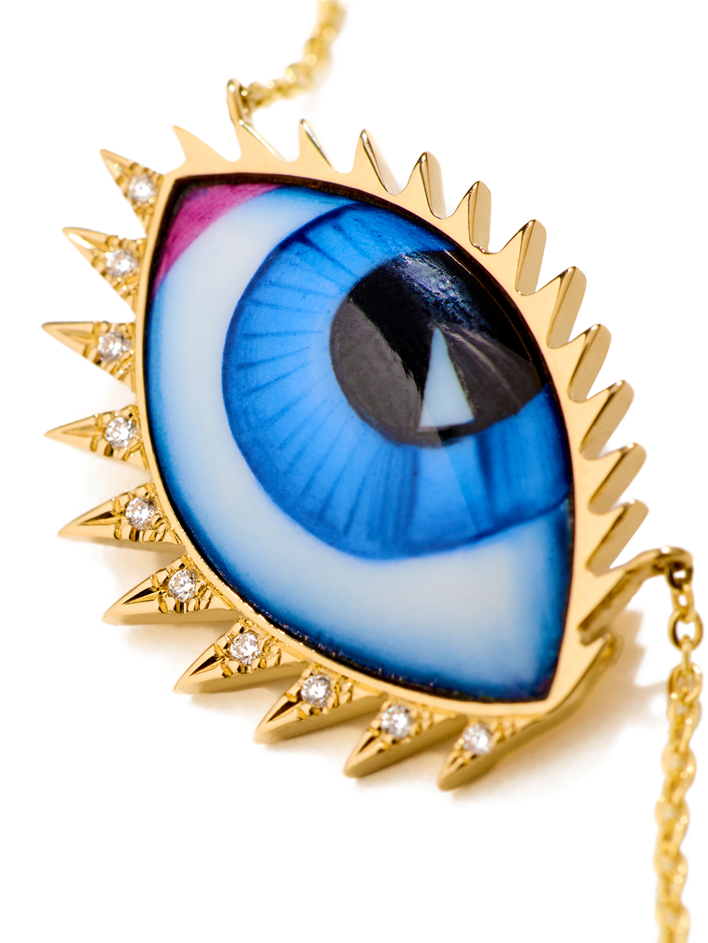Collier Apollo Grand Bleu signé Lito réalisé en or jaune 14 carats. Un pendentif émaillé représentant un oeil dans les tons bleu. Détails des cil en or, sertis de diamants taille brillant.