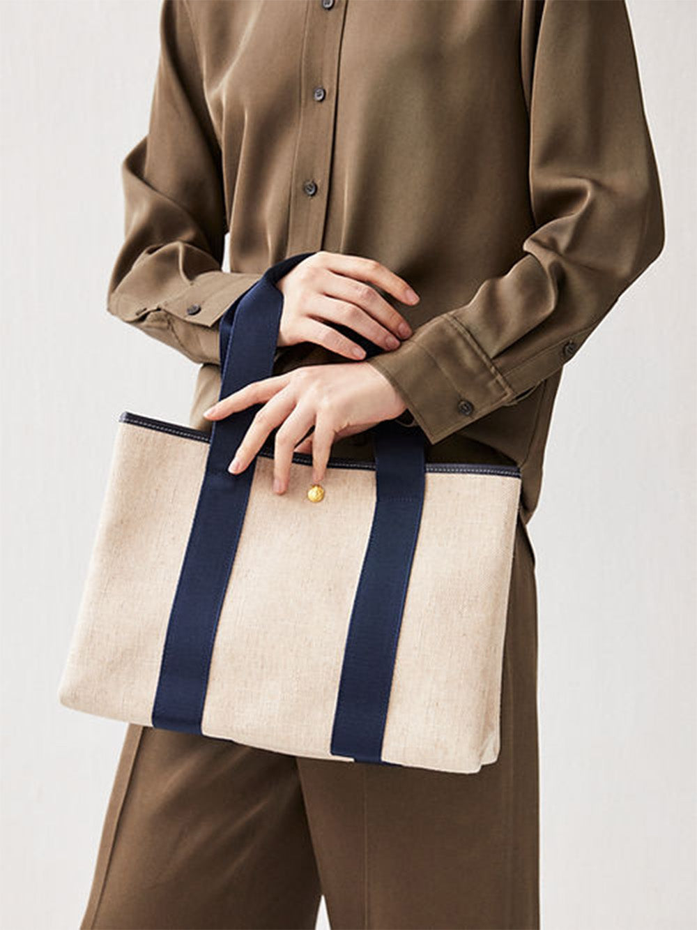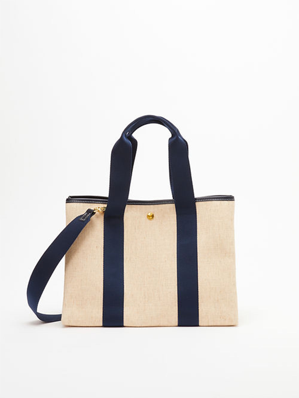 Sac Traversée M Linen Navy signé Rue de Verneuil confectionné en coton beige contrastant avec les hanses bleu marine.