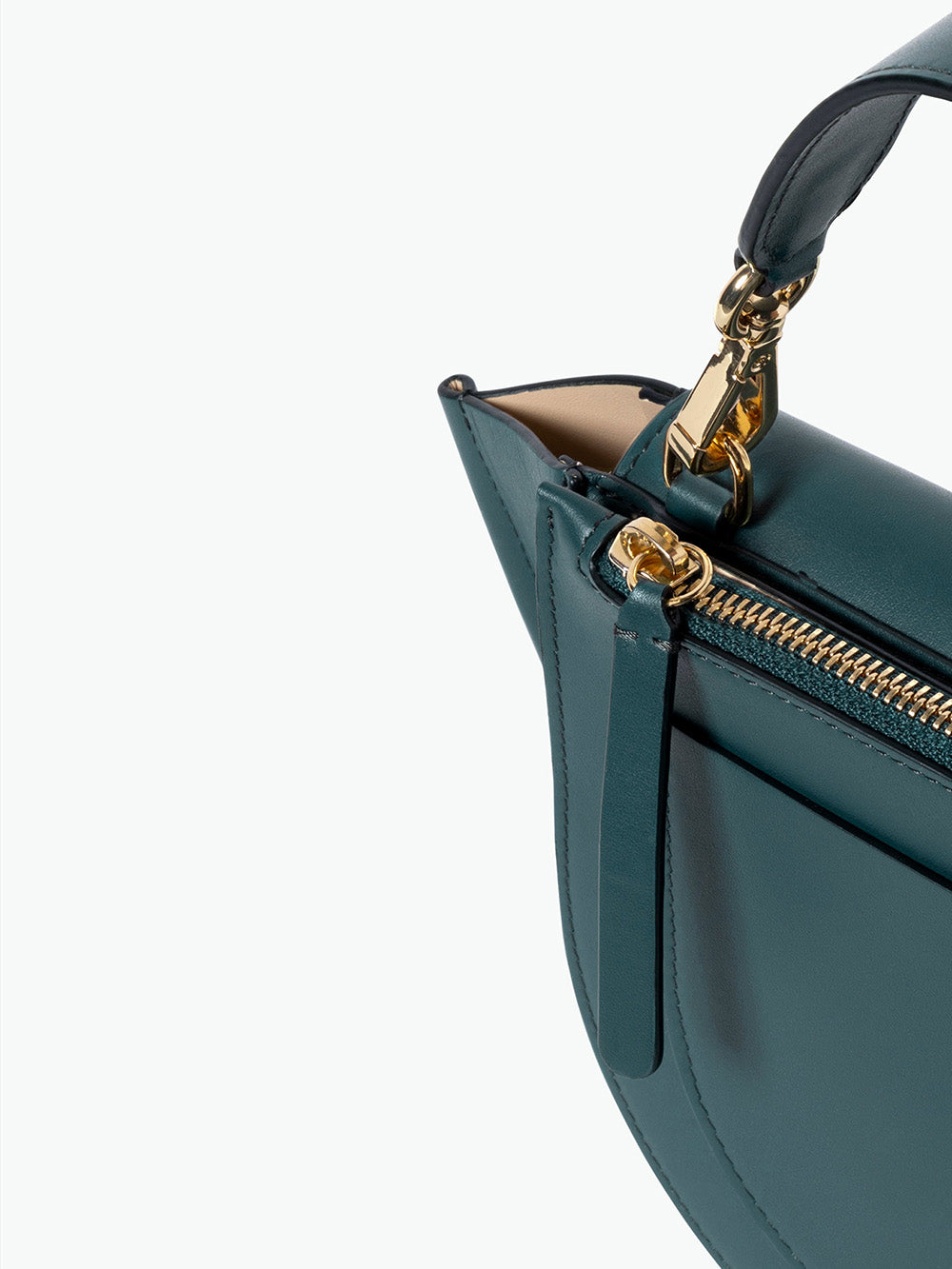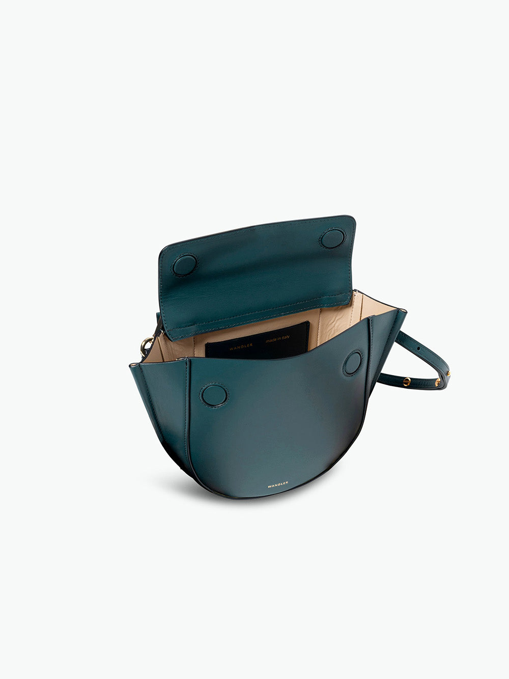 Sac Hortensia Mini signé Wandler confectionné en cuir bleu canard. Un sac de forme circulaire pouvant se porter à la main ou en bandoulière grâce à une sangle détachable.