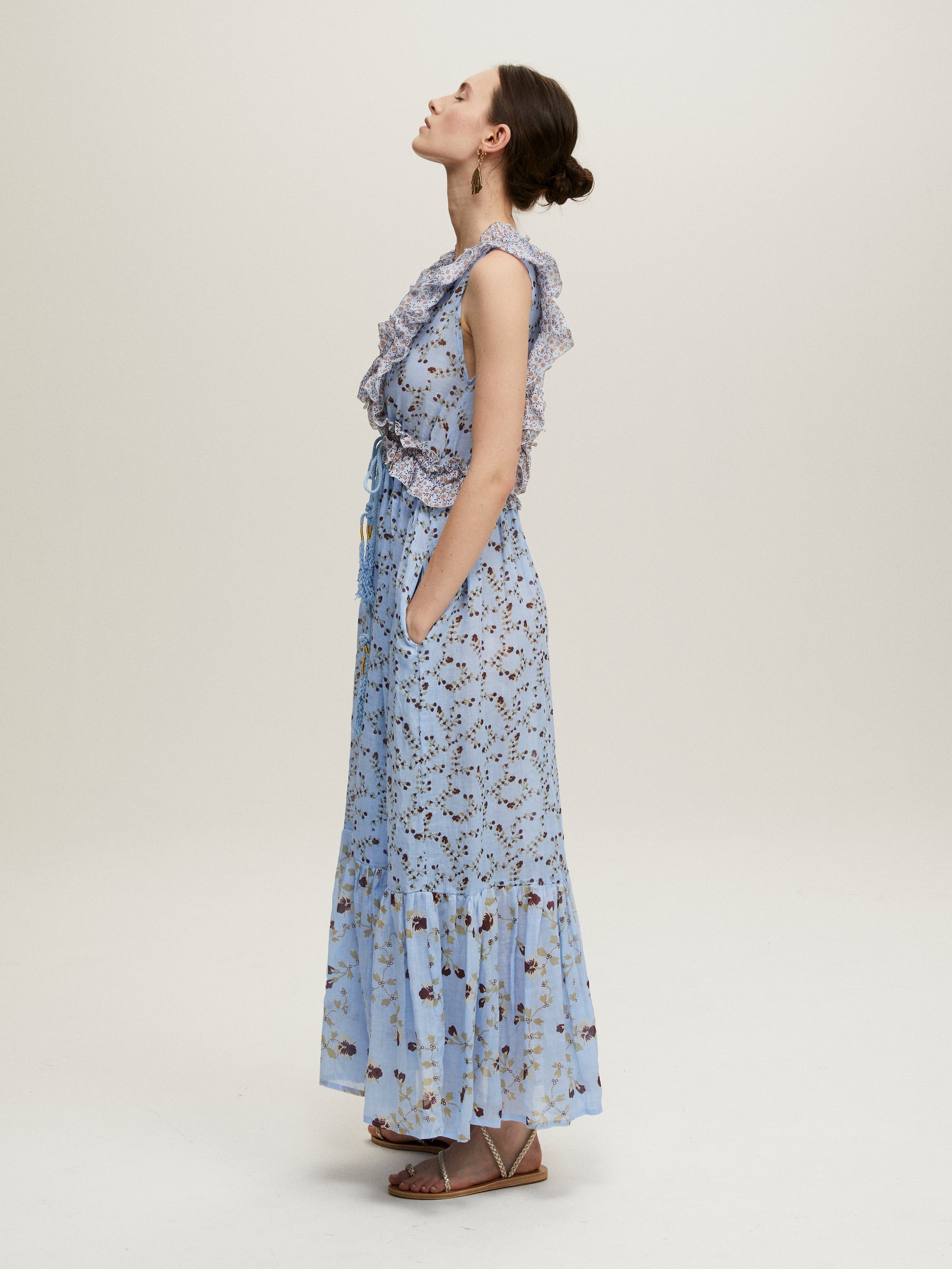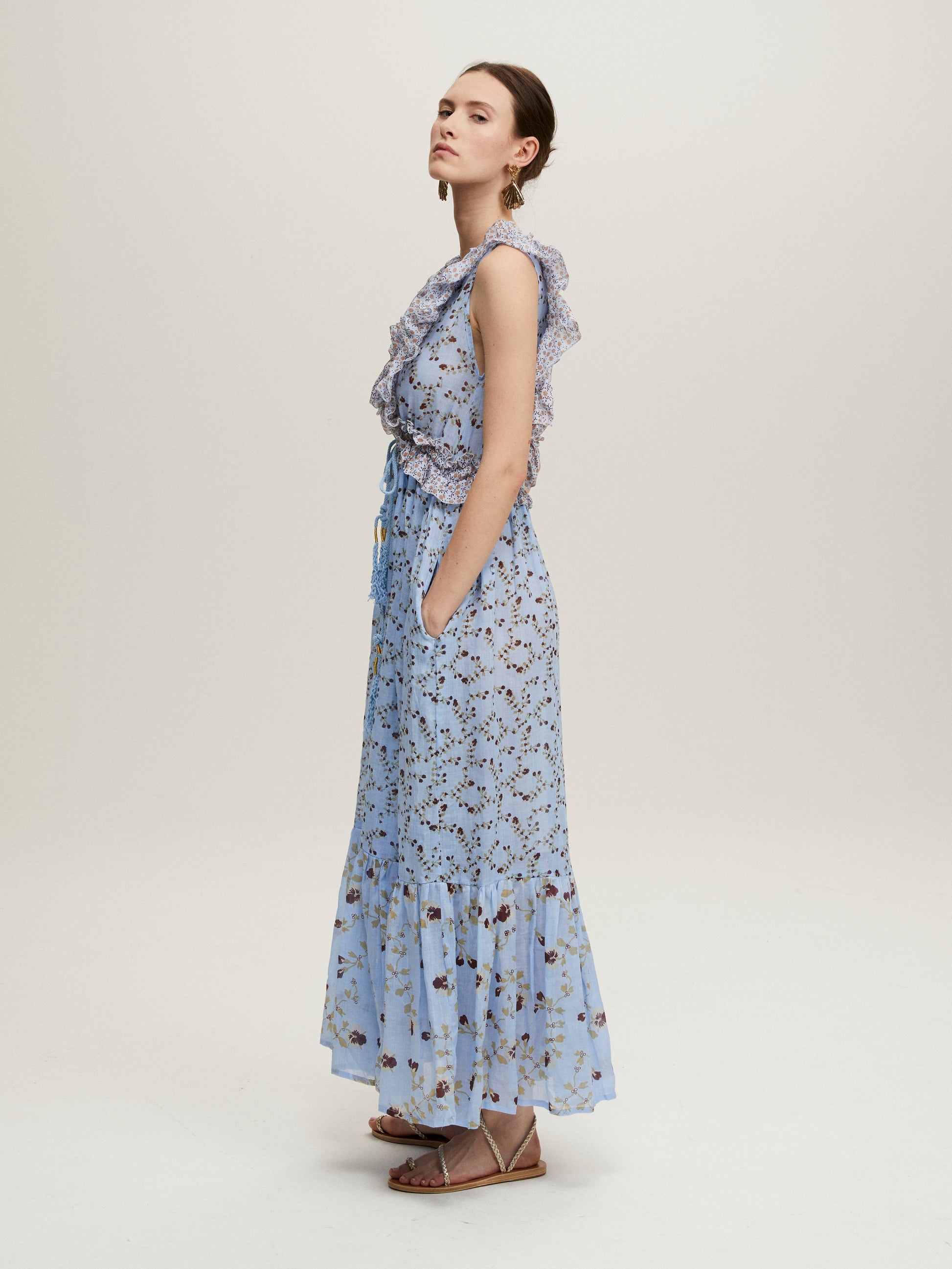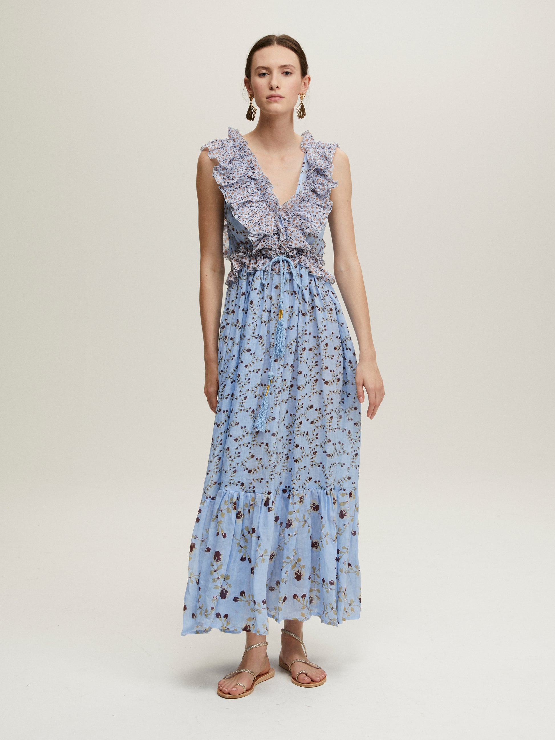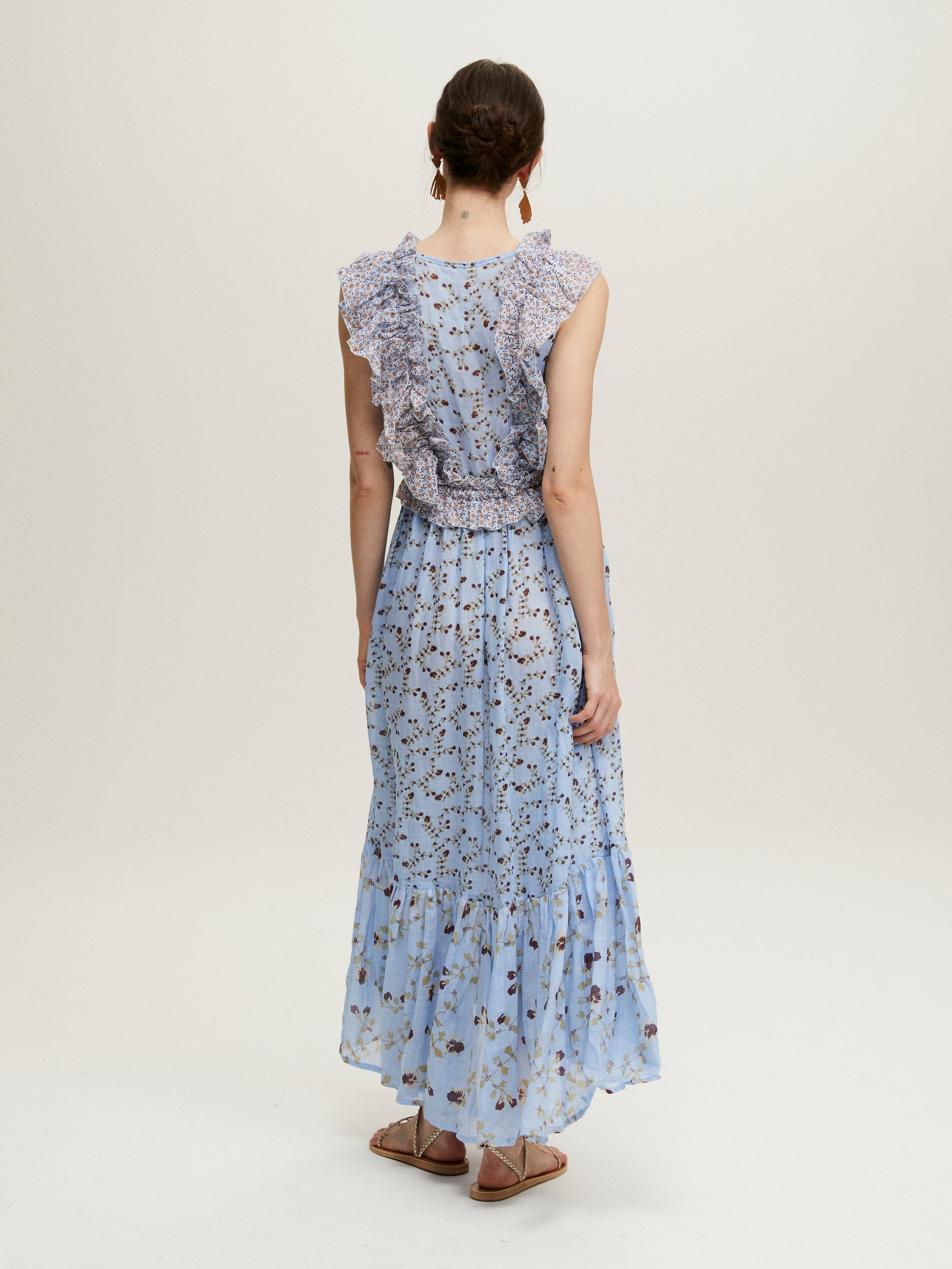Robe Marie Antoinette signée Yvonne S confectionné en lin imprimé à la main bleu ciel imprimé de fleurs dans les tons violet. Une robe midi décorée de volants au niveau de la poitrine.