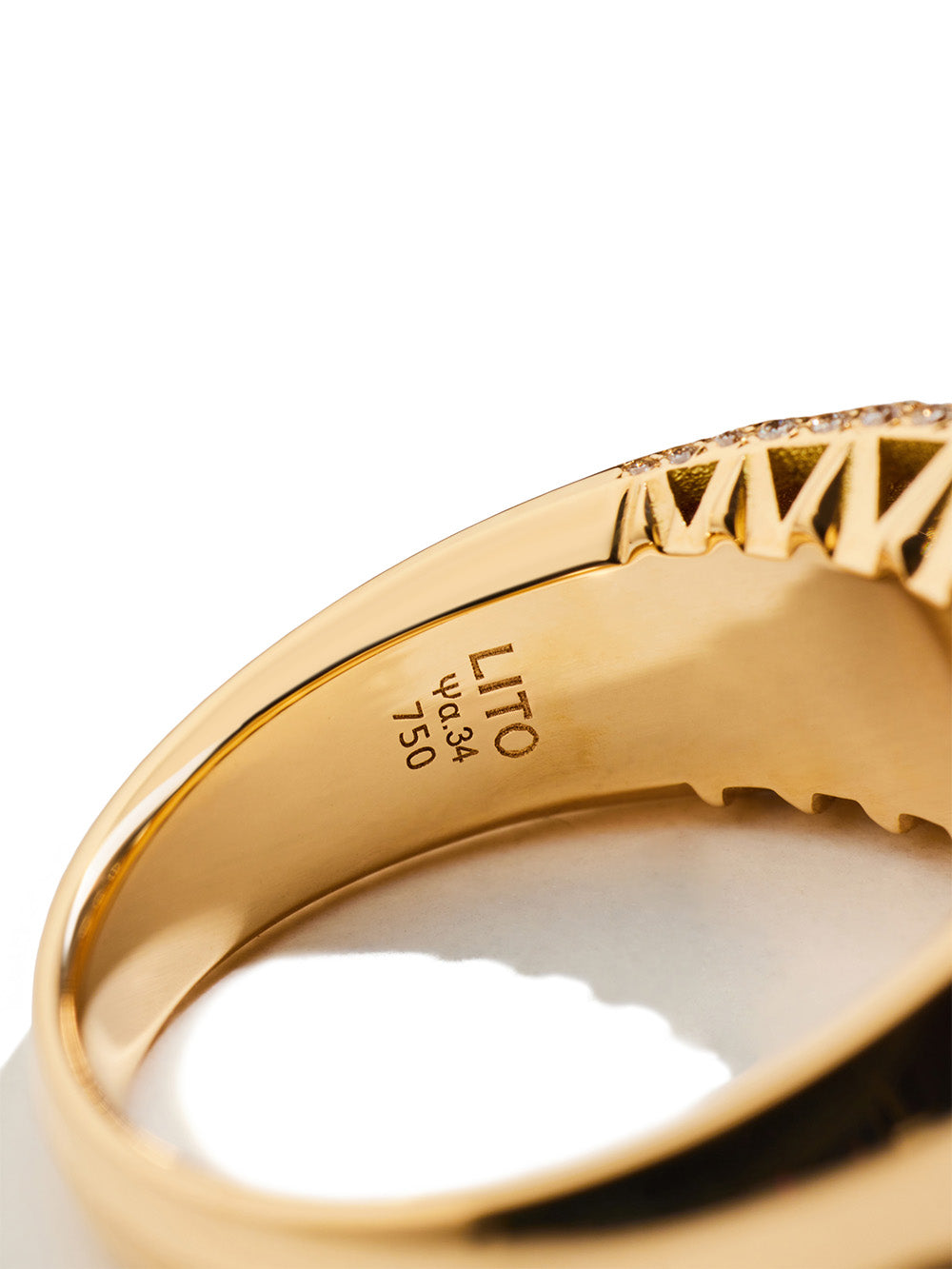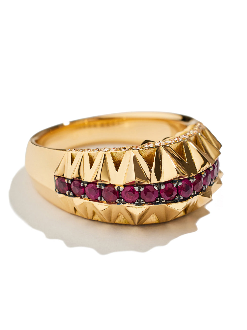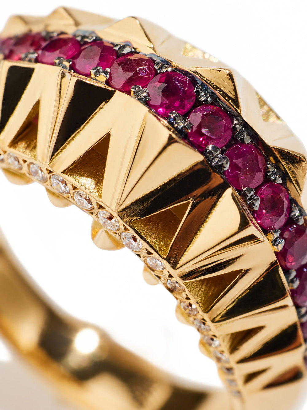 Bague Chrysler Crash signée Lito confectionnée en or jaune 18 carats serti de diamants blanc taille brillant et de rubis.
