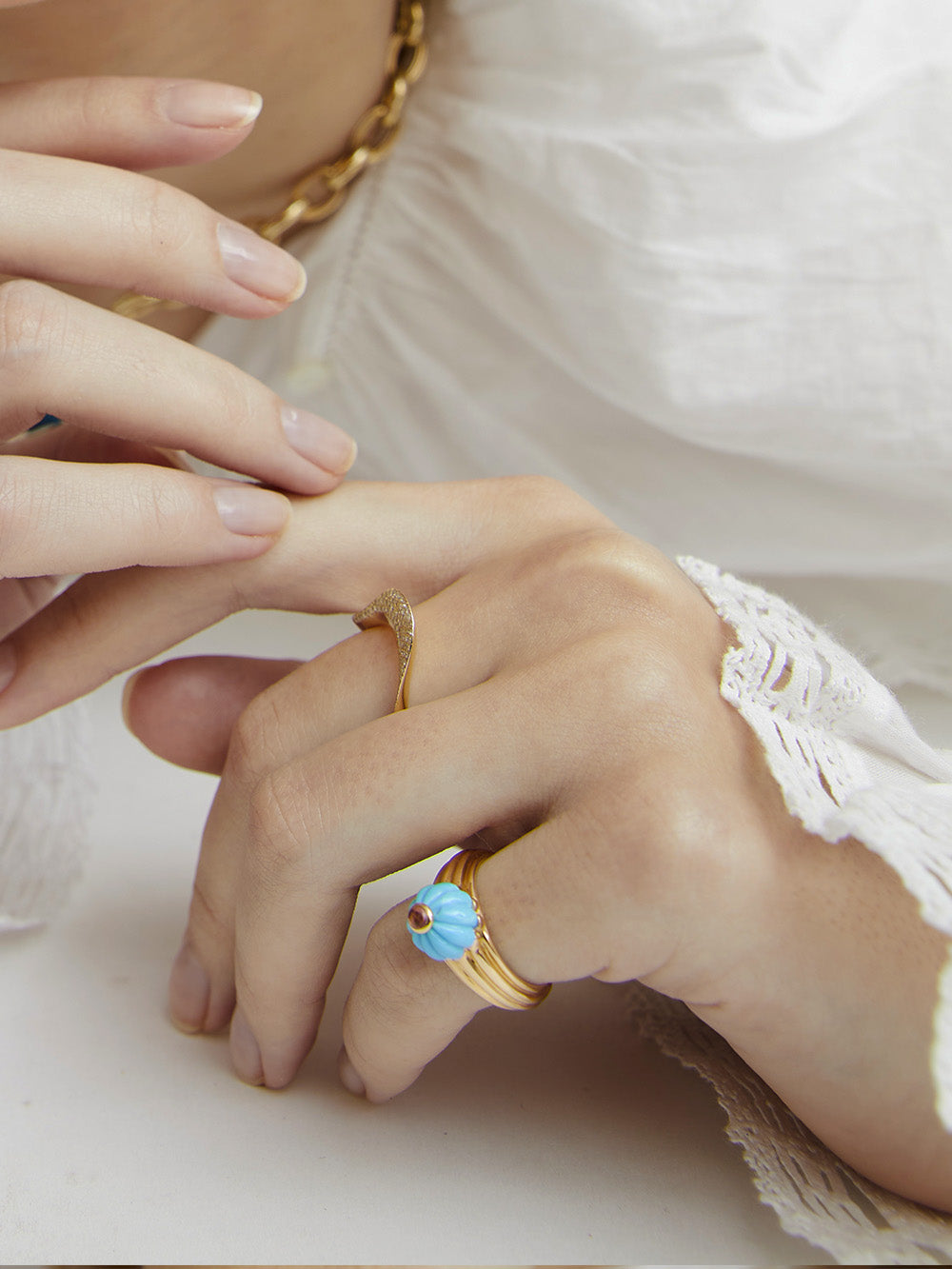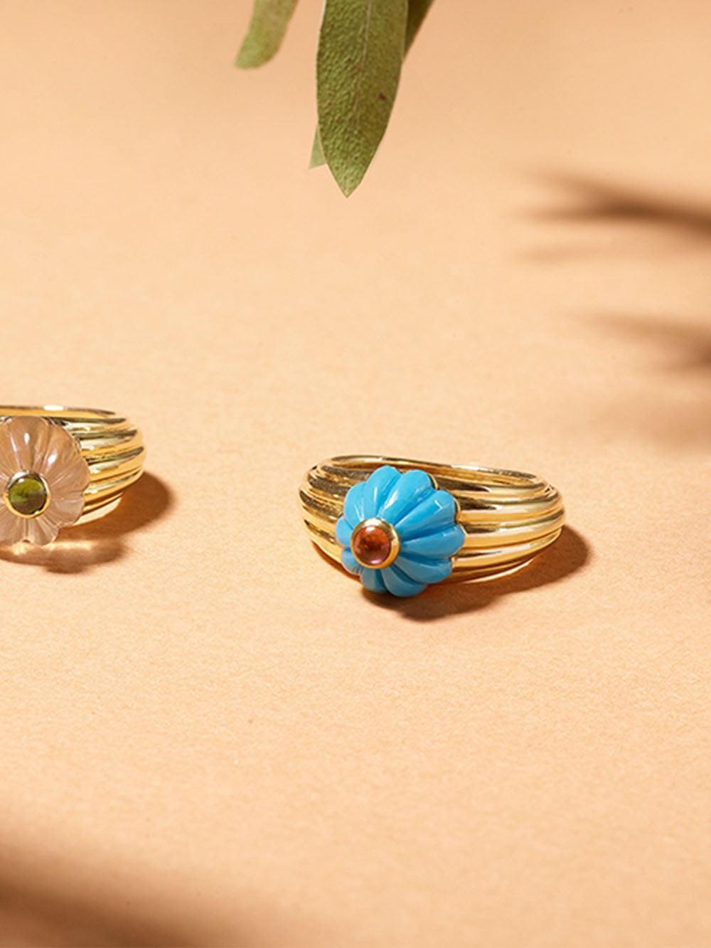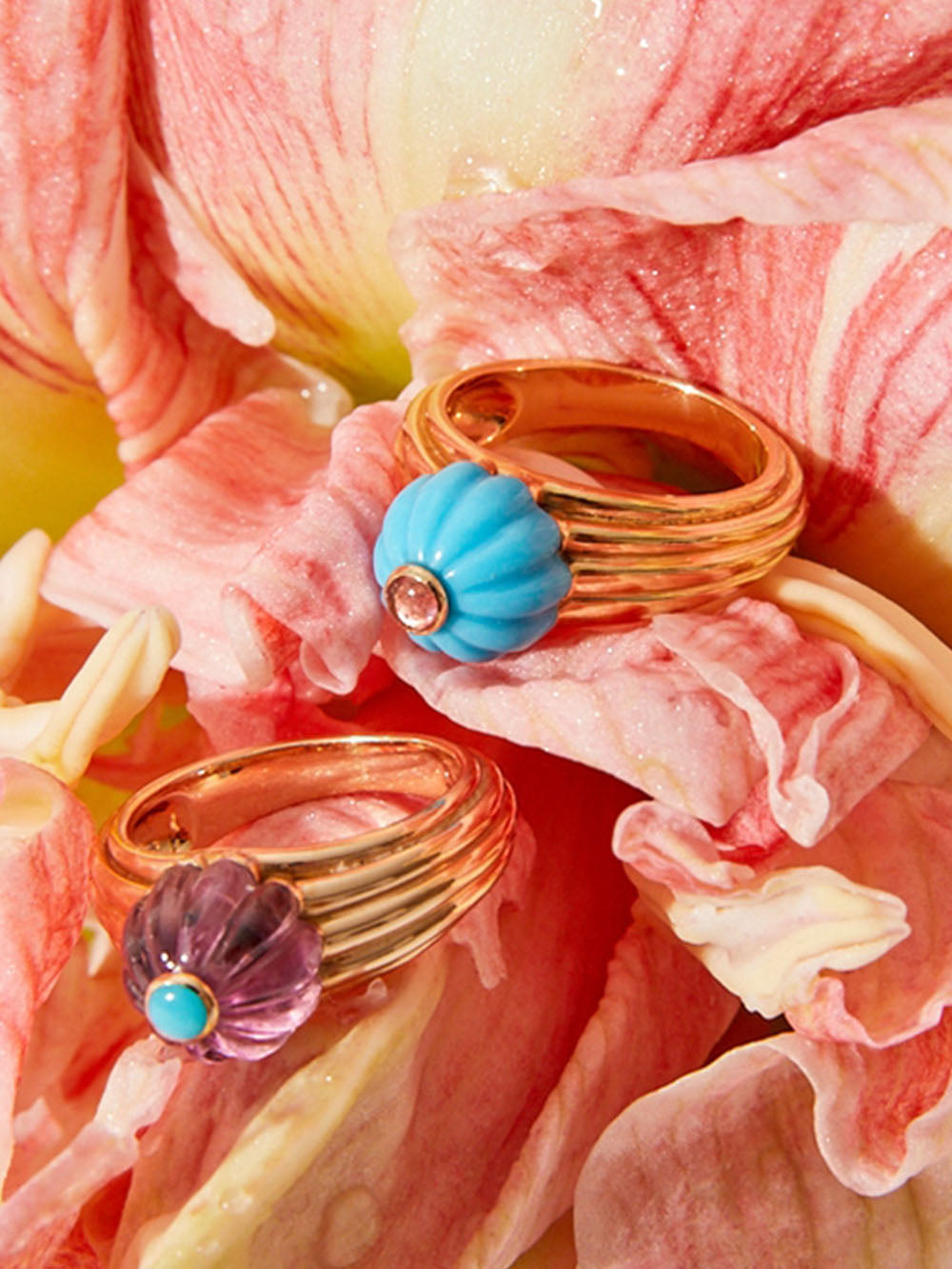 Cette bague Gelato turquoise et tourmaline rose est imaginée par la créatrice Salomé Rico. Elle se compose d'un half melon cut en turquoise avec cabochon en tourmaline rose et d'un anneau en or jaune godronné 18 carats. Réalisée à la main à Paris, cette pièce forte reflète l'ADN de la maison.