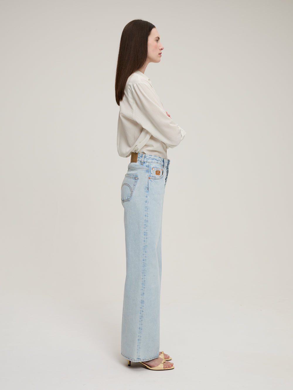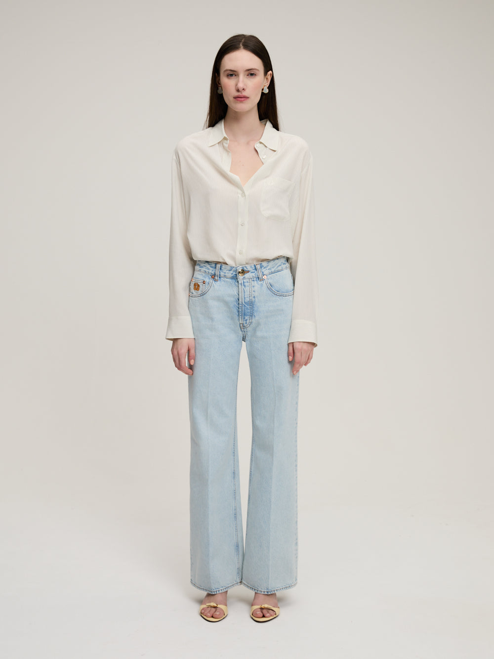 Jean Maline Nariida Ice signé Blazé Milano confectionné dans une toile de coton au délavage bleu clair. Un pantalon taille haute à la coupe évasée accompagné d'une broderie du logo de la marque à l'avant droit.