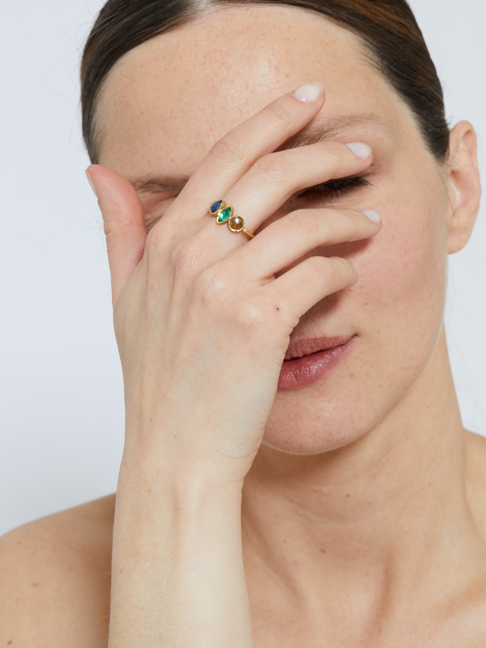 Bague triple pierres précieuses en or jaune 18 carats, composée d'un saphir un diamant et une émeraude signée Brooke Gregson.
