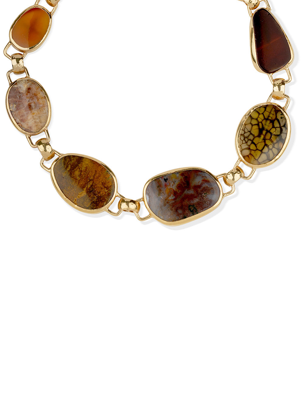 Collier Aura signé Françoise x Gas Bijoux. Un bijou doré à l'or fin serti d'un assortiment d'agates colorées sélectionnées parmi 55 ans de création et réutilisées dans une démarche d'upcycling. Une pièce unique en jeu de volume variable.