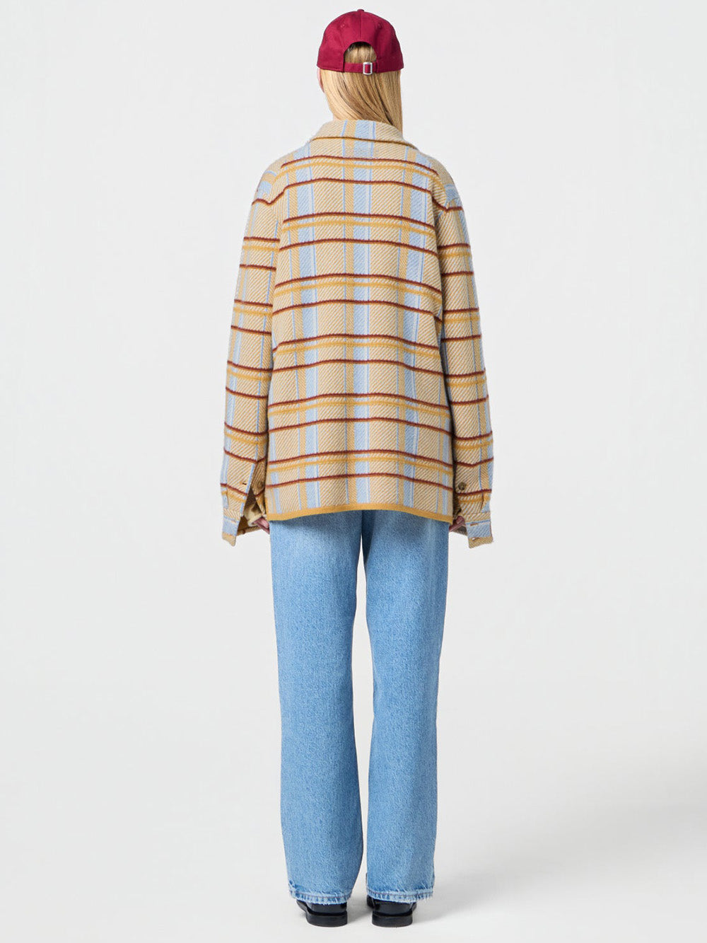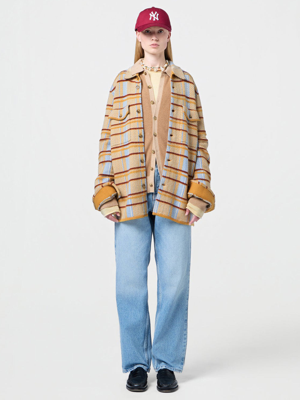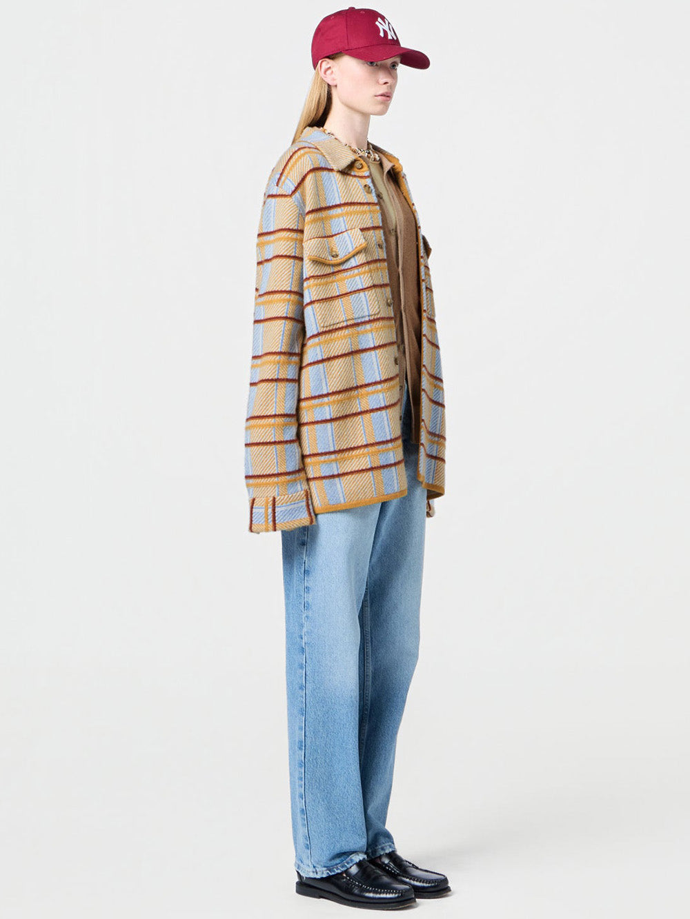 Chemise Plaid Work signée Guest In Residence confectionnée en cachemire dans les tons moutarde, bleu ciel et marron. Une chemise de style bûcheron à la coupe oversized.