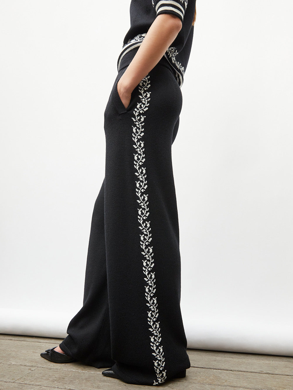 Pantalon Érable signé Molli confectionné dans une maille fine en laine noire décoré d'un motifs jacquard en guirlande sur toute la longueur de la jambe. Un pantalon à la coupe droite évasée muni de poches sur les côtés.