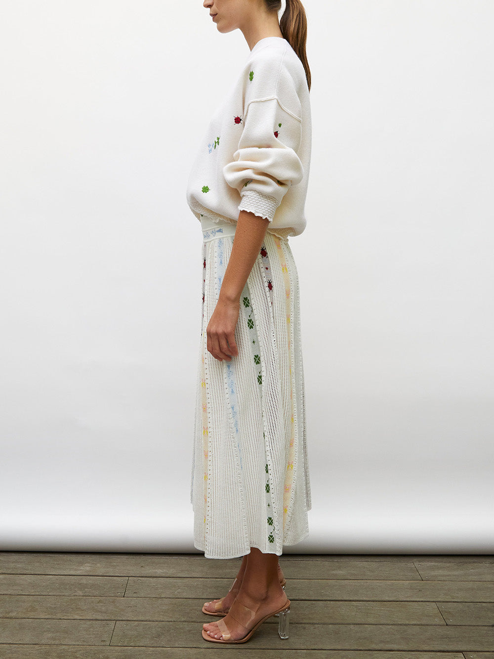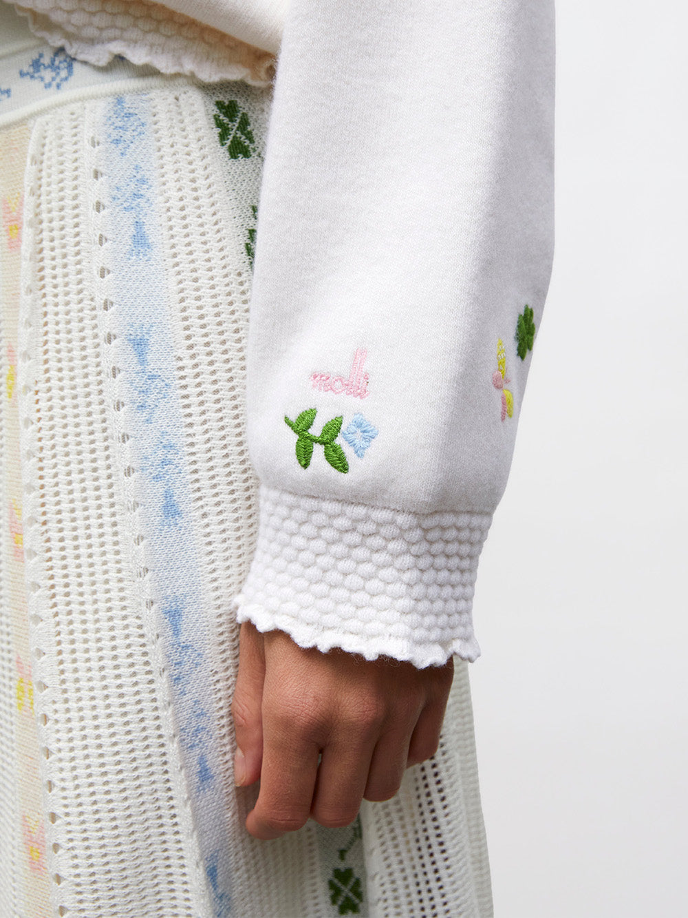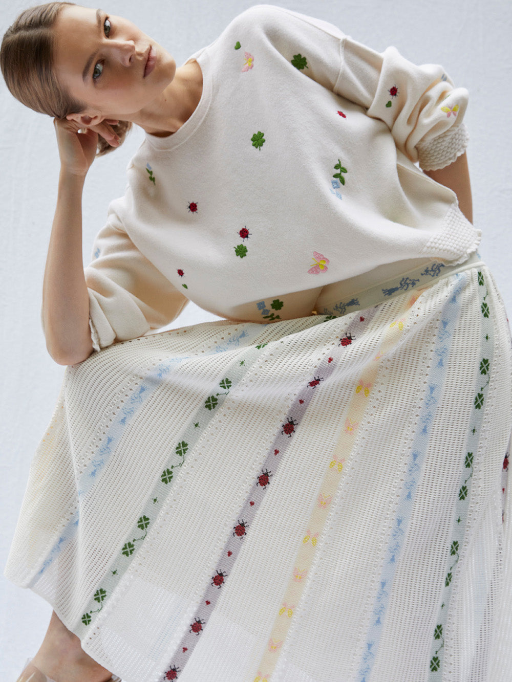 Pull Dump signé Molli confectionné en laine de couleur blanc cassé et décoré de broderies printanières comme des papillons, des petites fleurs, des coccinelles et trèfles à quatre feuilles. Un pull à la coupe inspiré du sweatshirt au style relevé par des bordures smockées au niveau des poignets et de la taille.