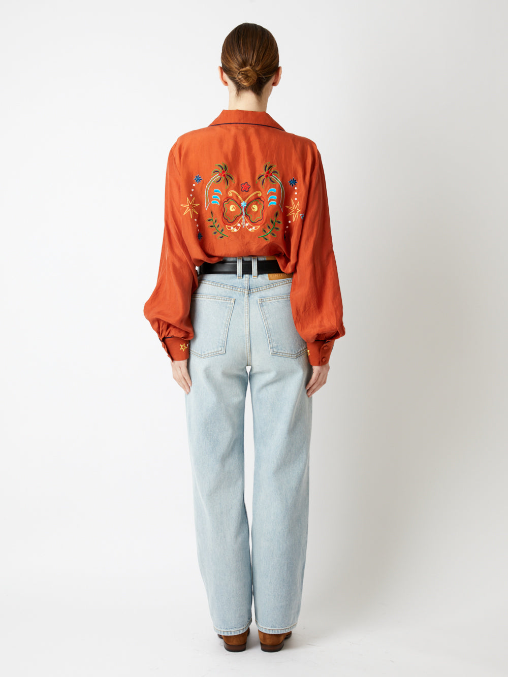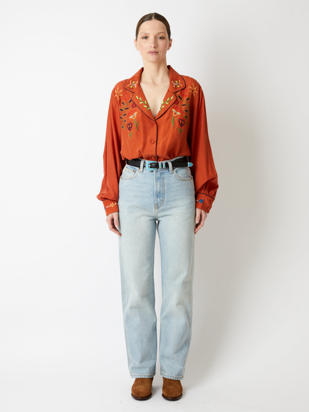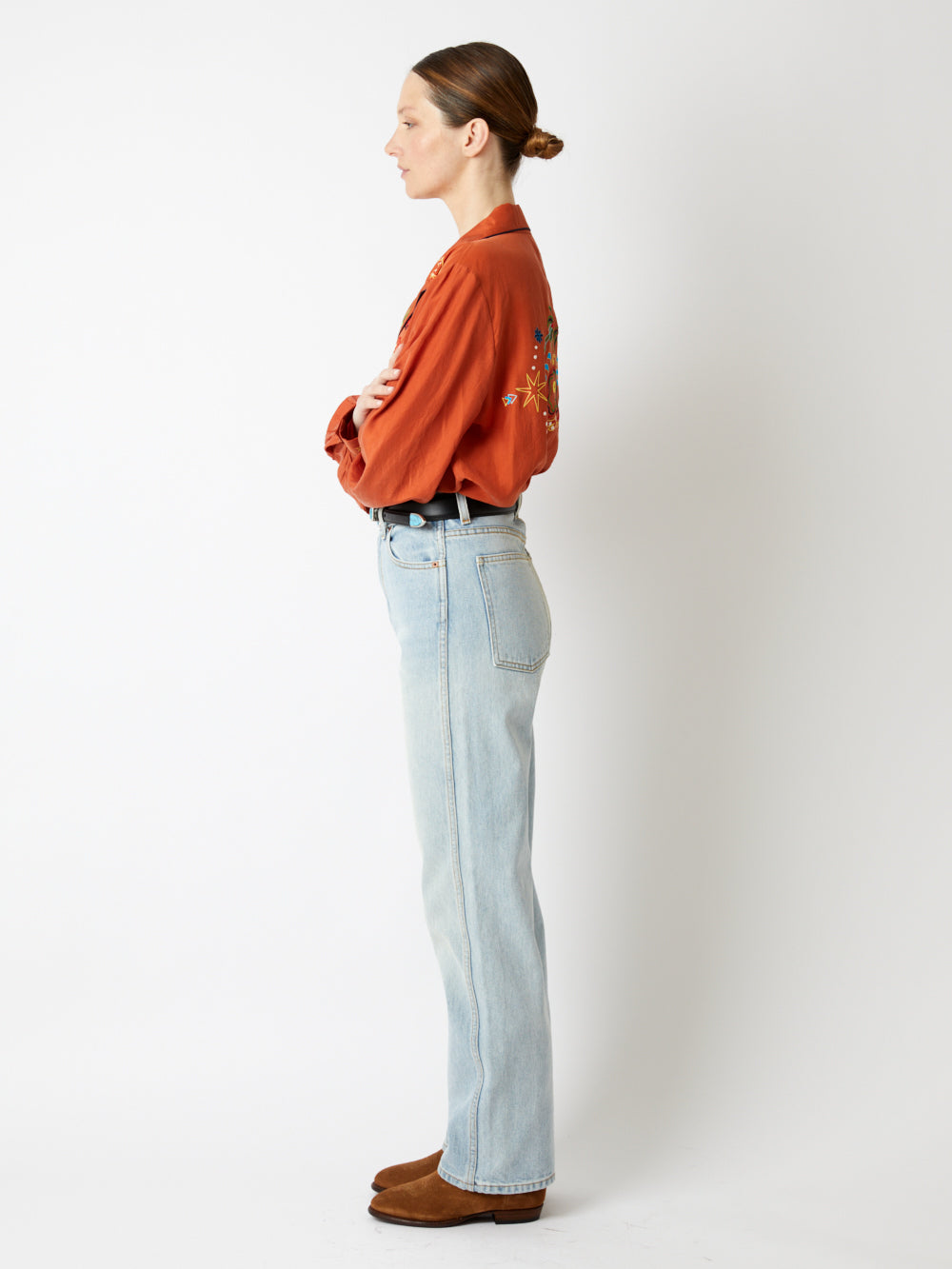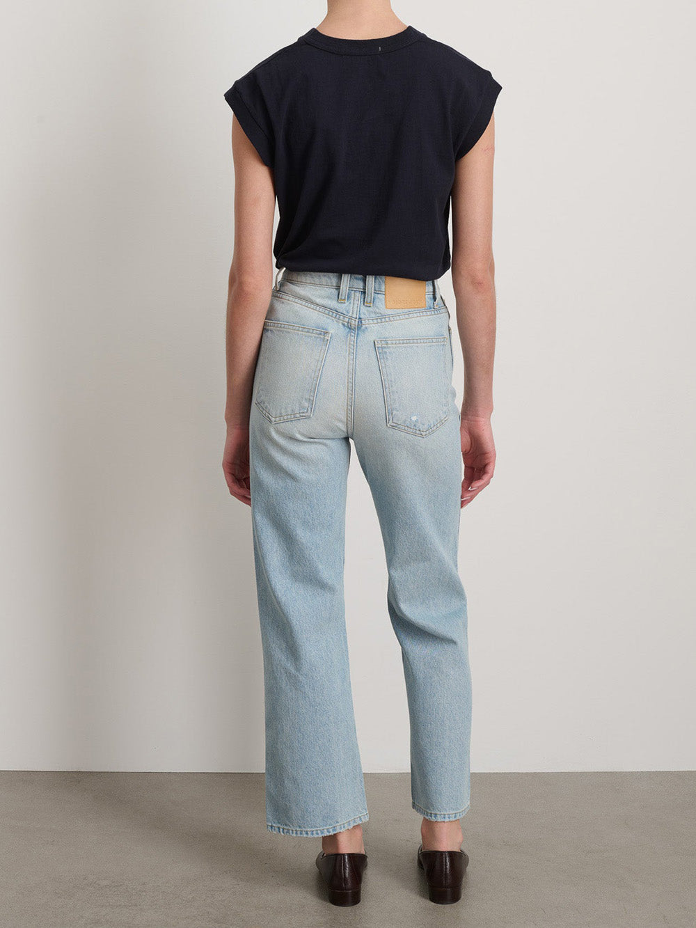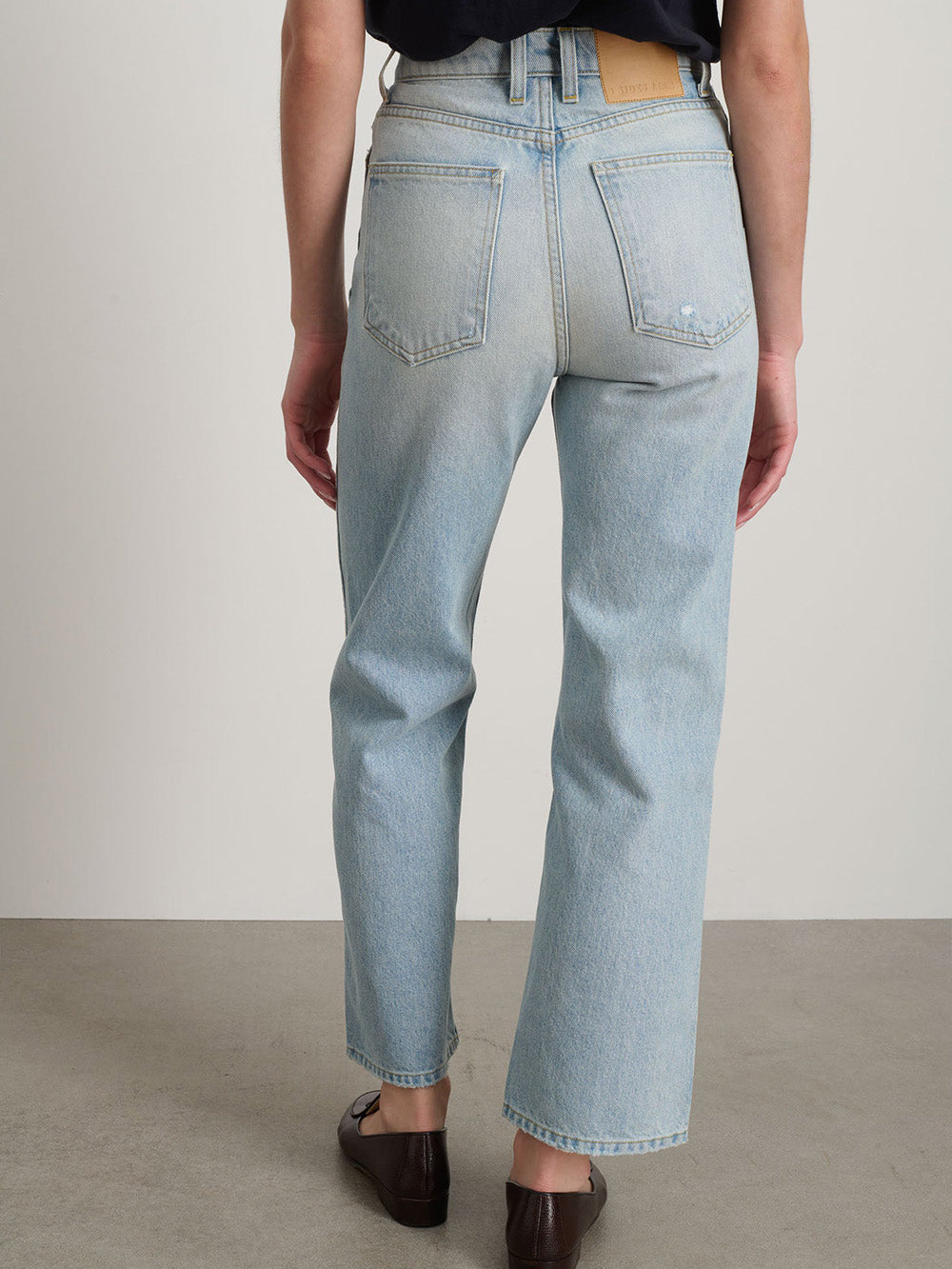 Le jean Plein couleur Super Light Vintage de la marque BSIDES, en denim bleu clair a une coupe droite avec une taille haute, des jambes légèrement évasées et raccourcies aux chevilles. Cette pièce est conçue à New York et fabriquée de manière responsable à Los Angeles.