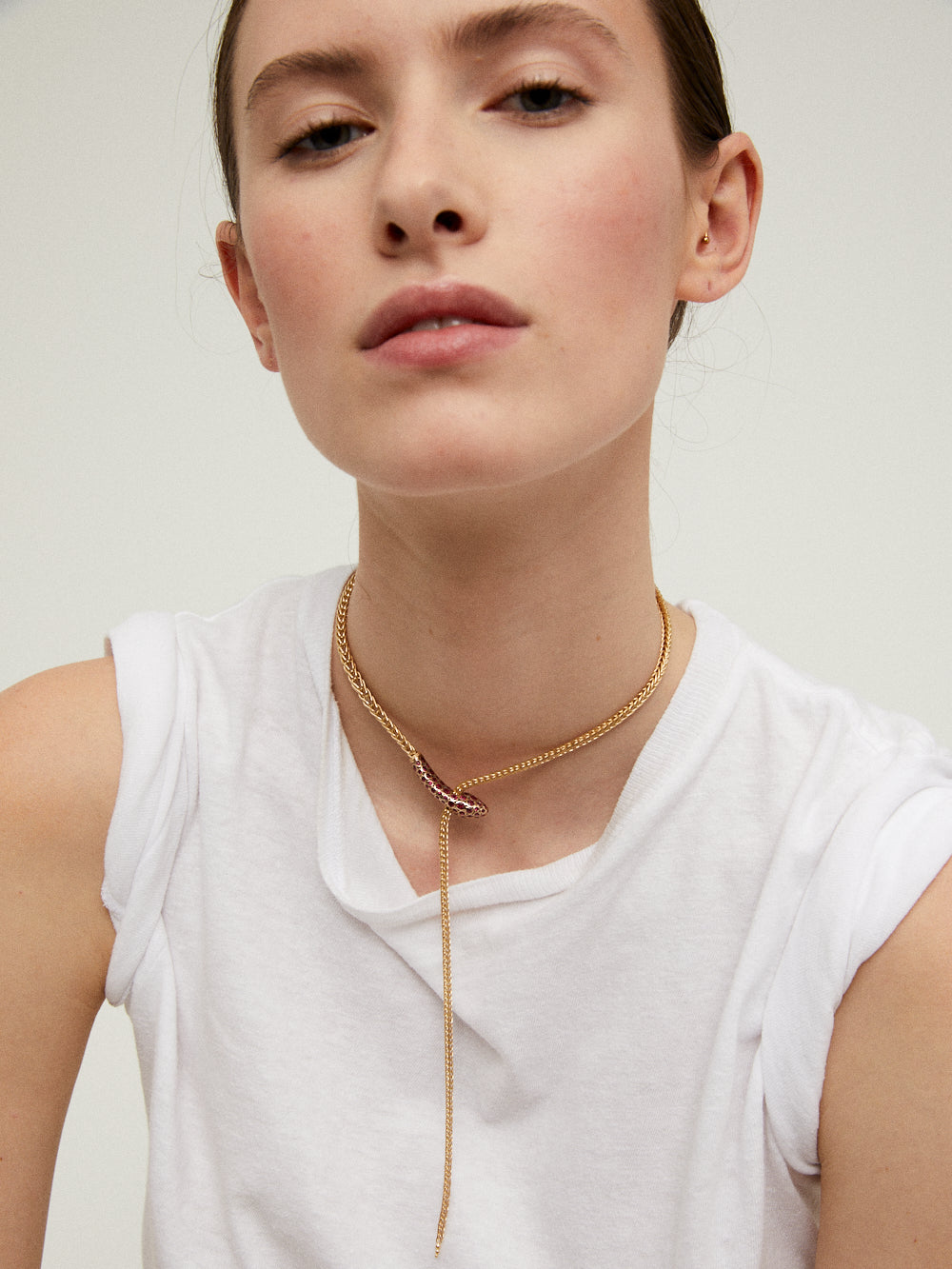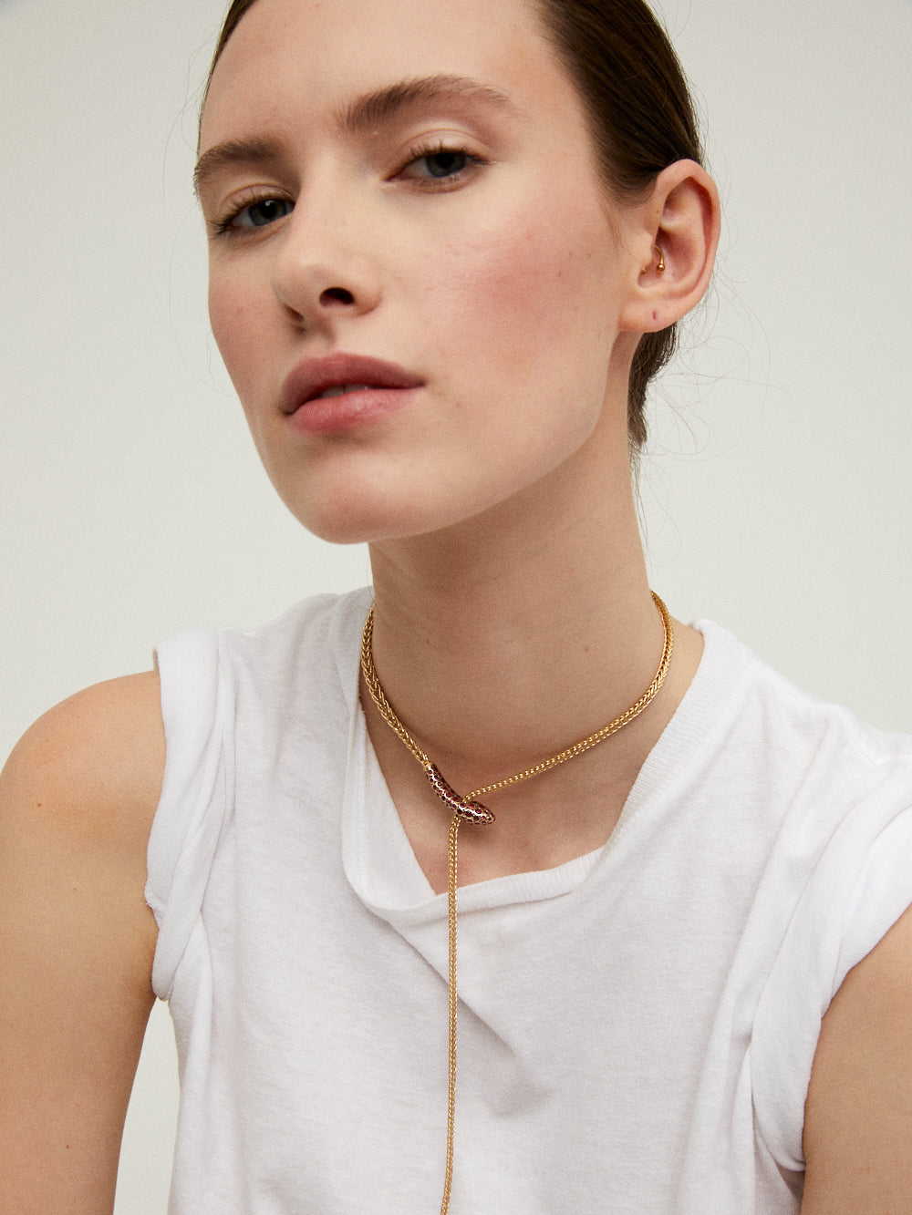 Collier Basilik signé Selim Mouzannar confectionnée en or jaune 18 carats en forme de serpent dont la tête est sertie de rubis. Une pièce exceptionnelle nommée "Basilik" en hommage au roi des serpents.