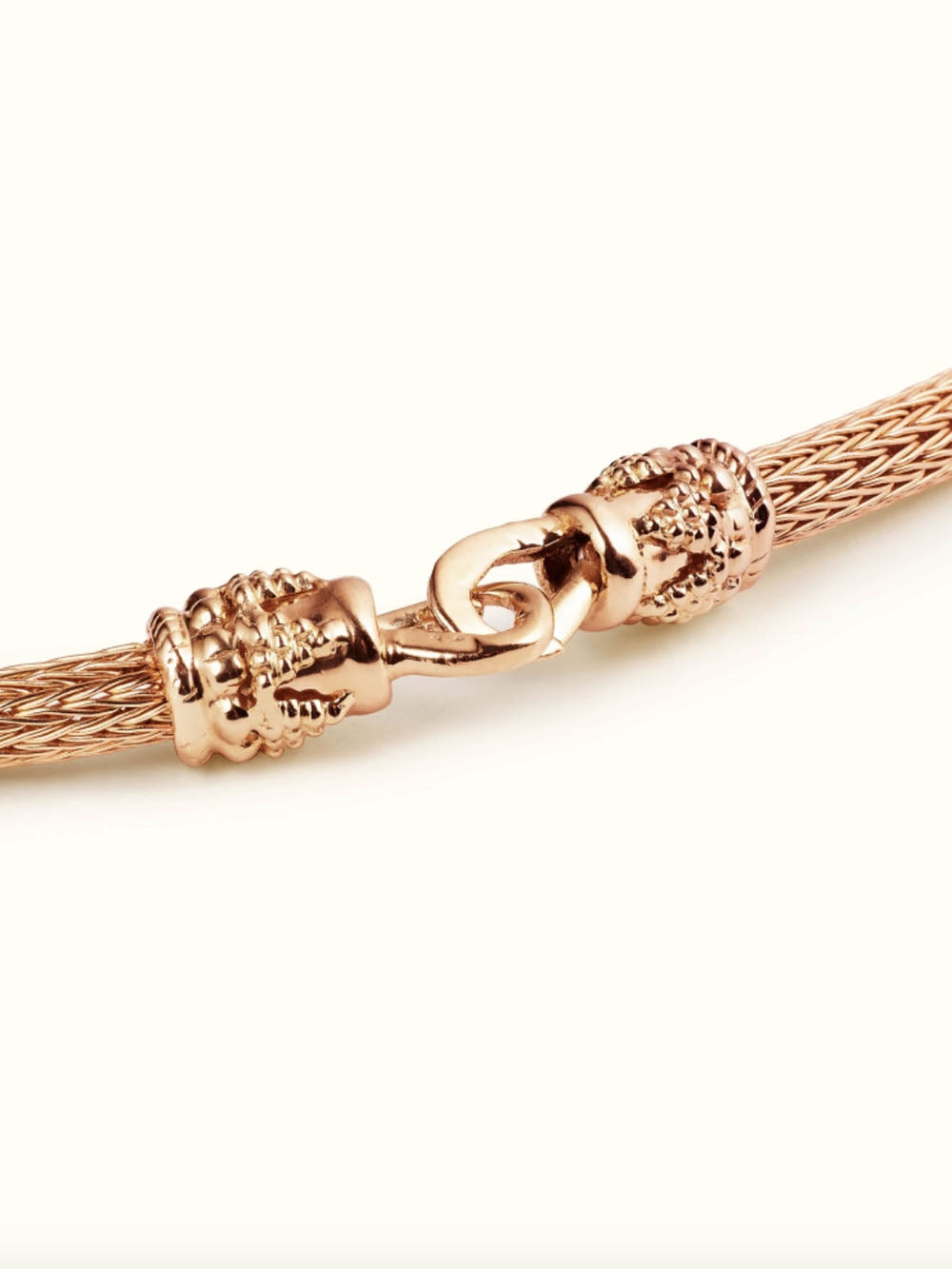 Chaine Indian or rose Marie Lichtenberg. Cette chaine en maille serpent est réalisée en or rose 14 carat. Elle dispose de menottes sur lesquelles peuvent se clipser les lockets Marie Lichtenberg. Chaque chaine Indian chocker est livrée dans sa boîte en papier mâché peinte à la main.