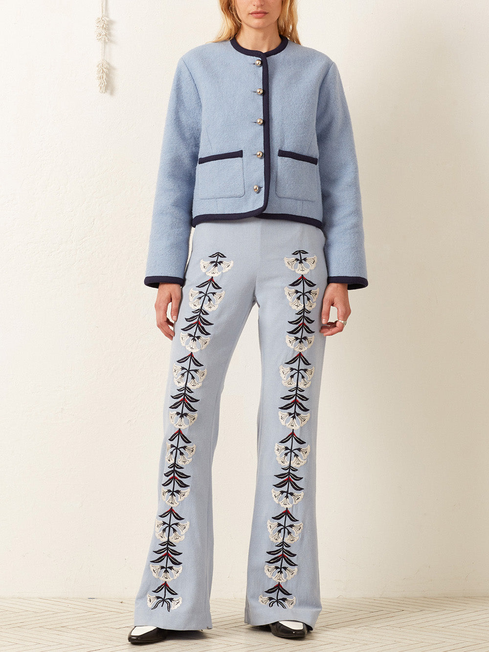 Pantalon Charlie Trumpet Love signé Alix of Bohemia confectionné en soie bleu ciel brodé de lys sur toute la longueur. Un pantalon à la coupe évasée au niveau des jambes, inspirée des années 1970.