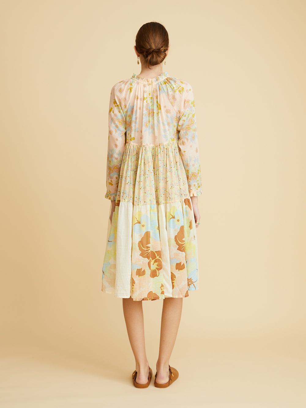 This Flower Bouquet print "Short to knee" dress is made in a lightweight cotton voile.This model has a midi length and a loose, ruffled cut. It has a ruffled and gathered round neck, a V-neckline with pom pom ties and metallic details and long sleeves with ruffled cuffs.