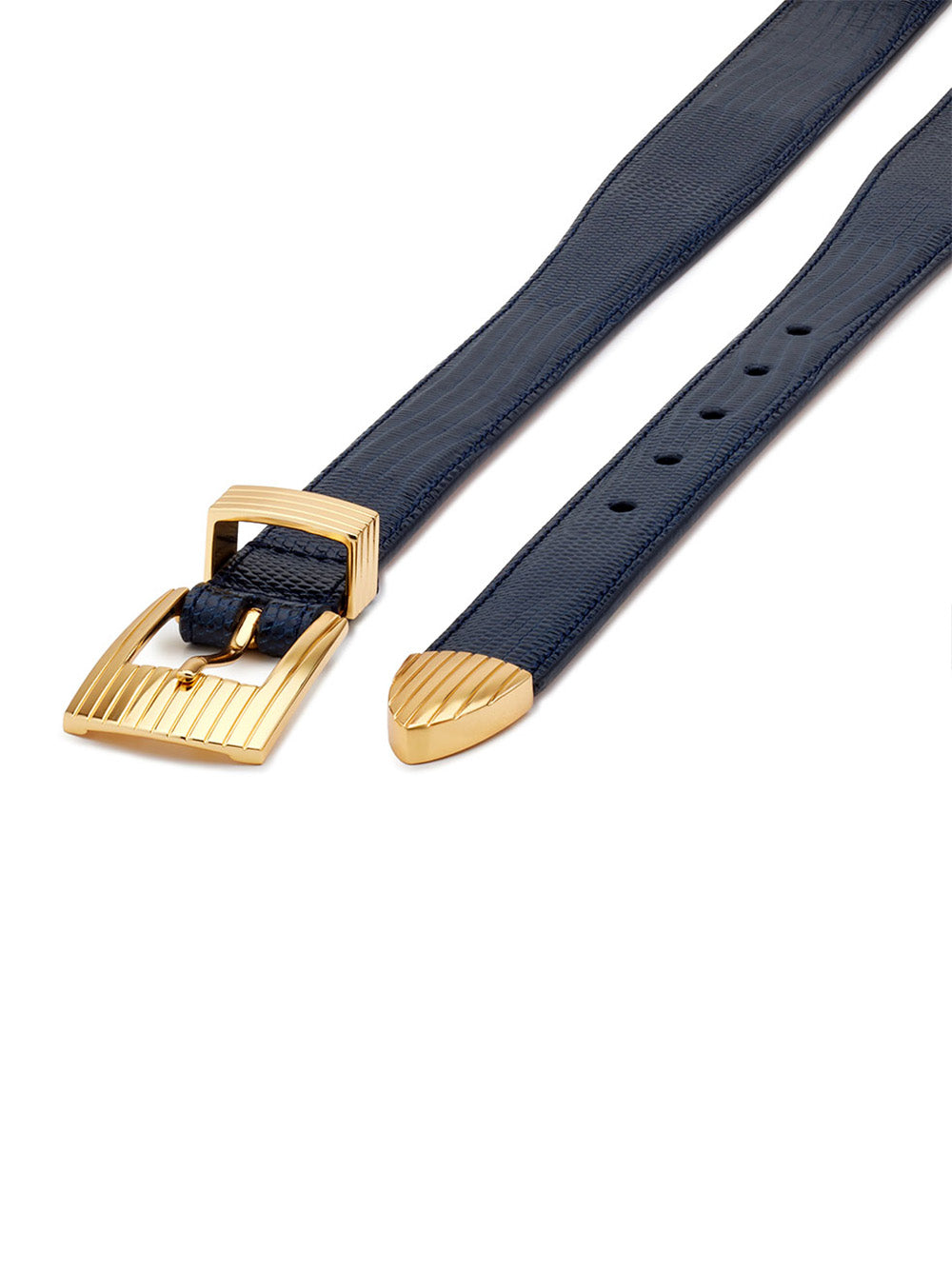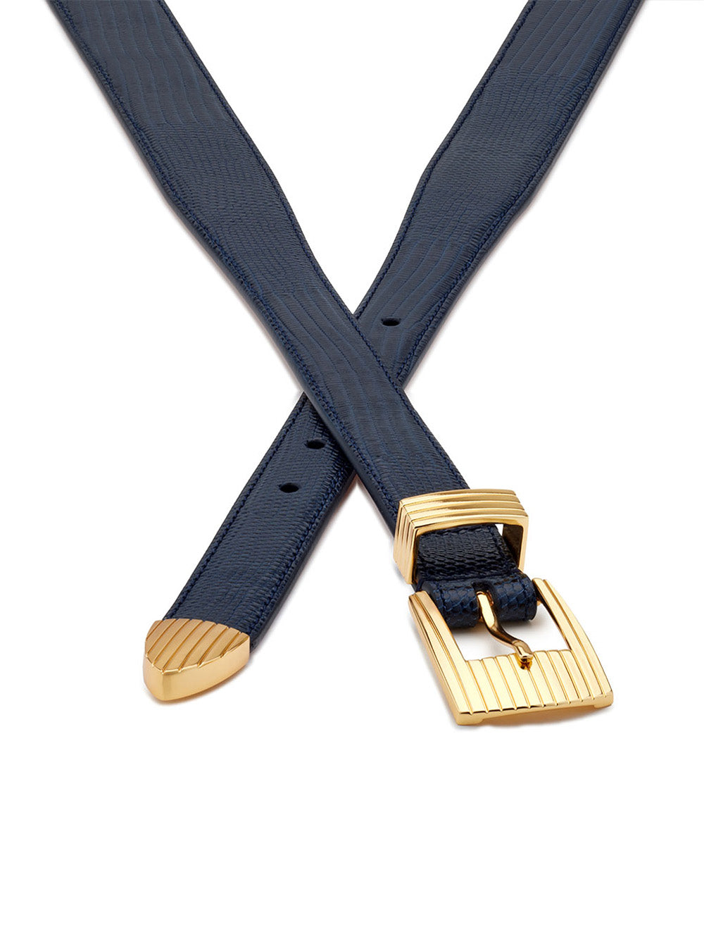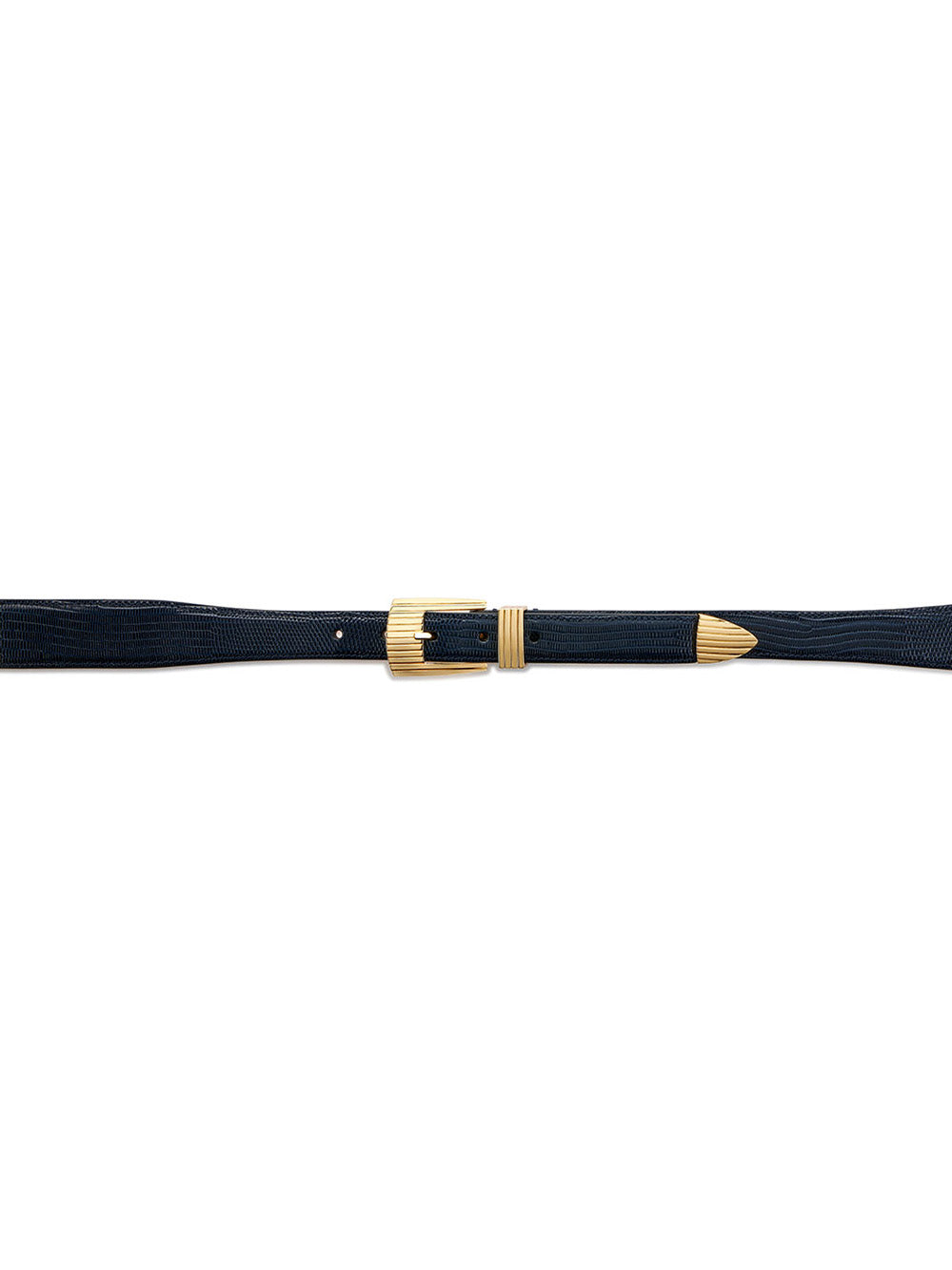 The Rodeo Lizard Belt by Silver Ostrich is entirely handmade in Italy. This belt is made of navy blue lizard skin effect leather. A strong and elegant piece.