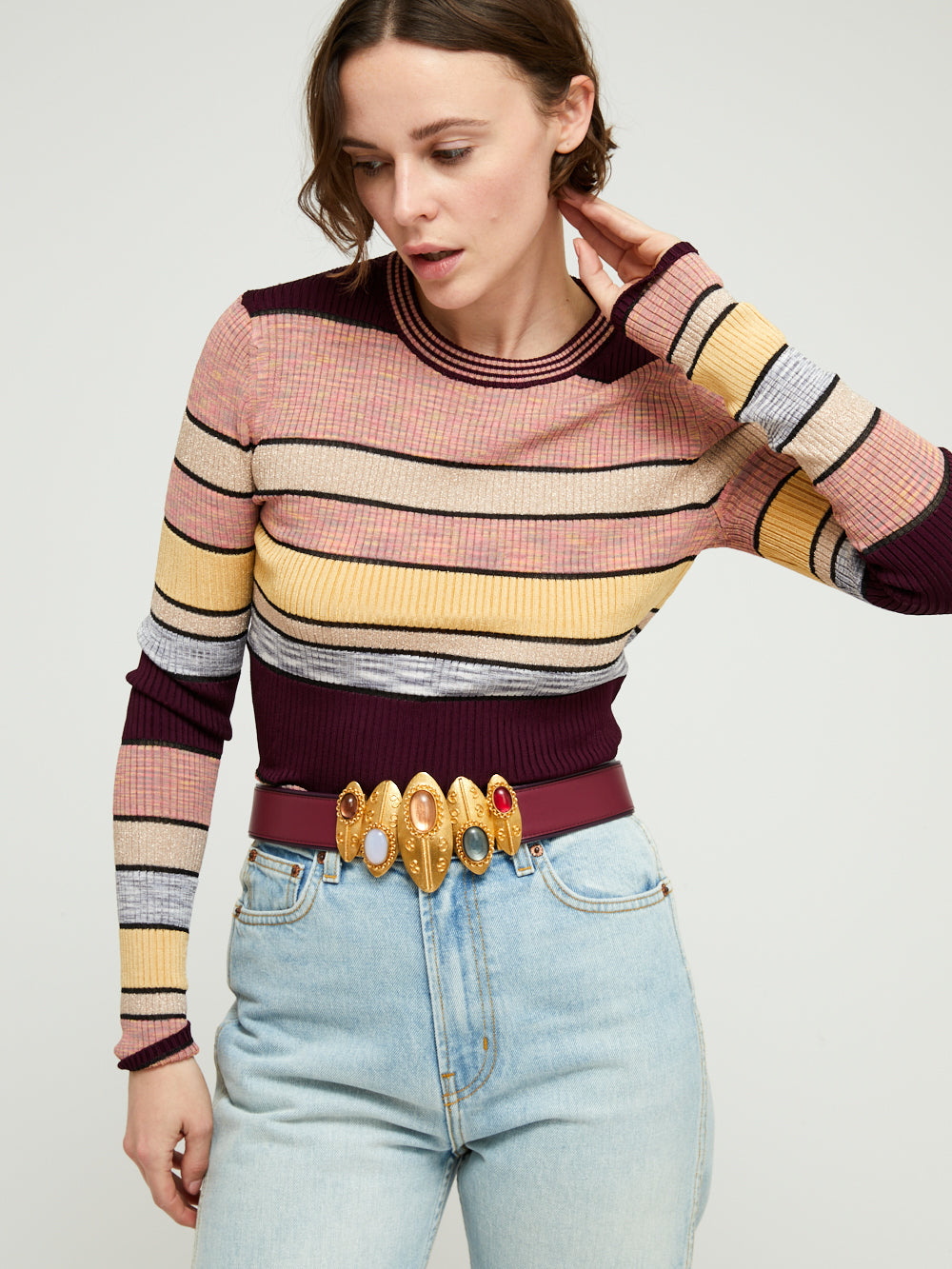Glass cabochons, 24k gold details, dark pink leather with purple piping.