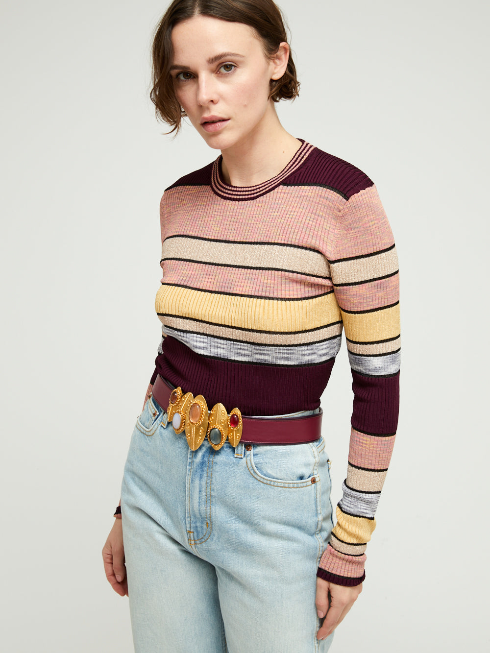 The Shield belt by Sonia Petroff is made of leather. Designed as five oval-shaped shields, hand-worked and decorated with metal threads. Set with glass cabochons ranging from purple, white, opaline, blue and pink.
