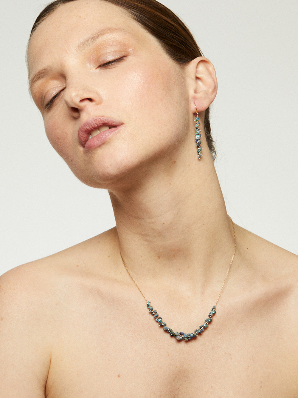 This Spiral necklace signed by SenThousandThings is composed of black opal beads assembled by hand in a spiral and mounted on an 18-carat gold chain.