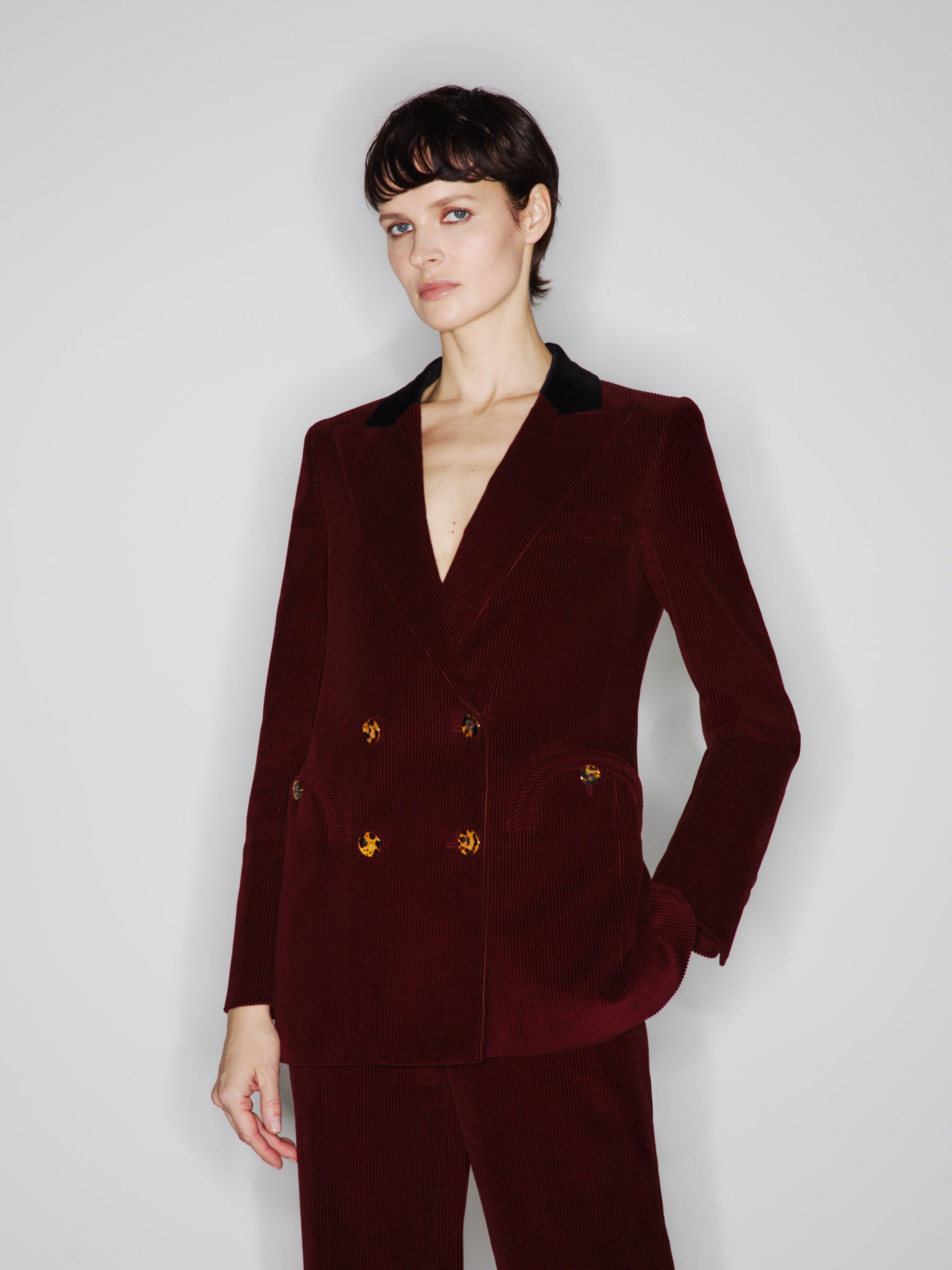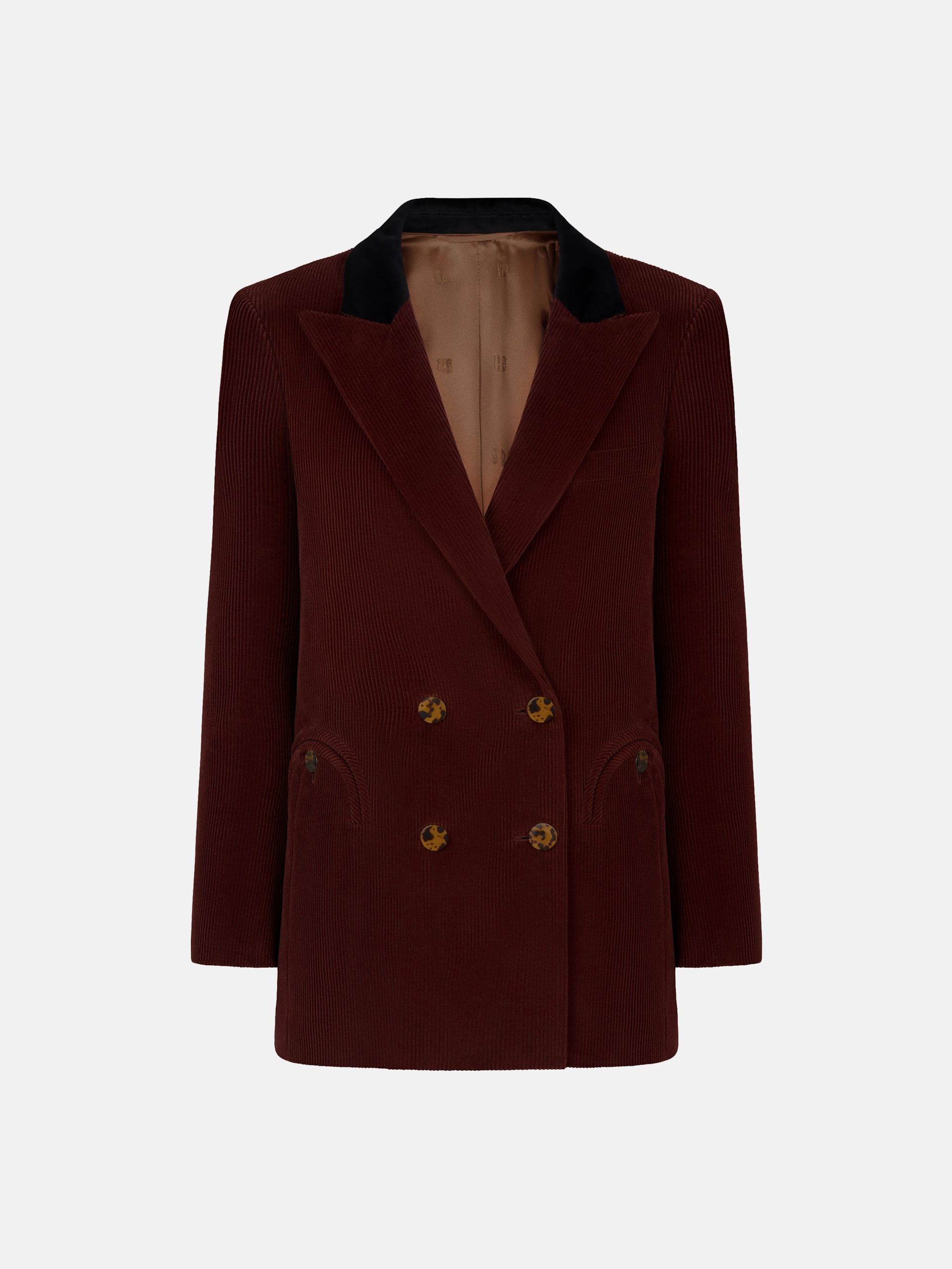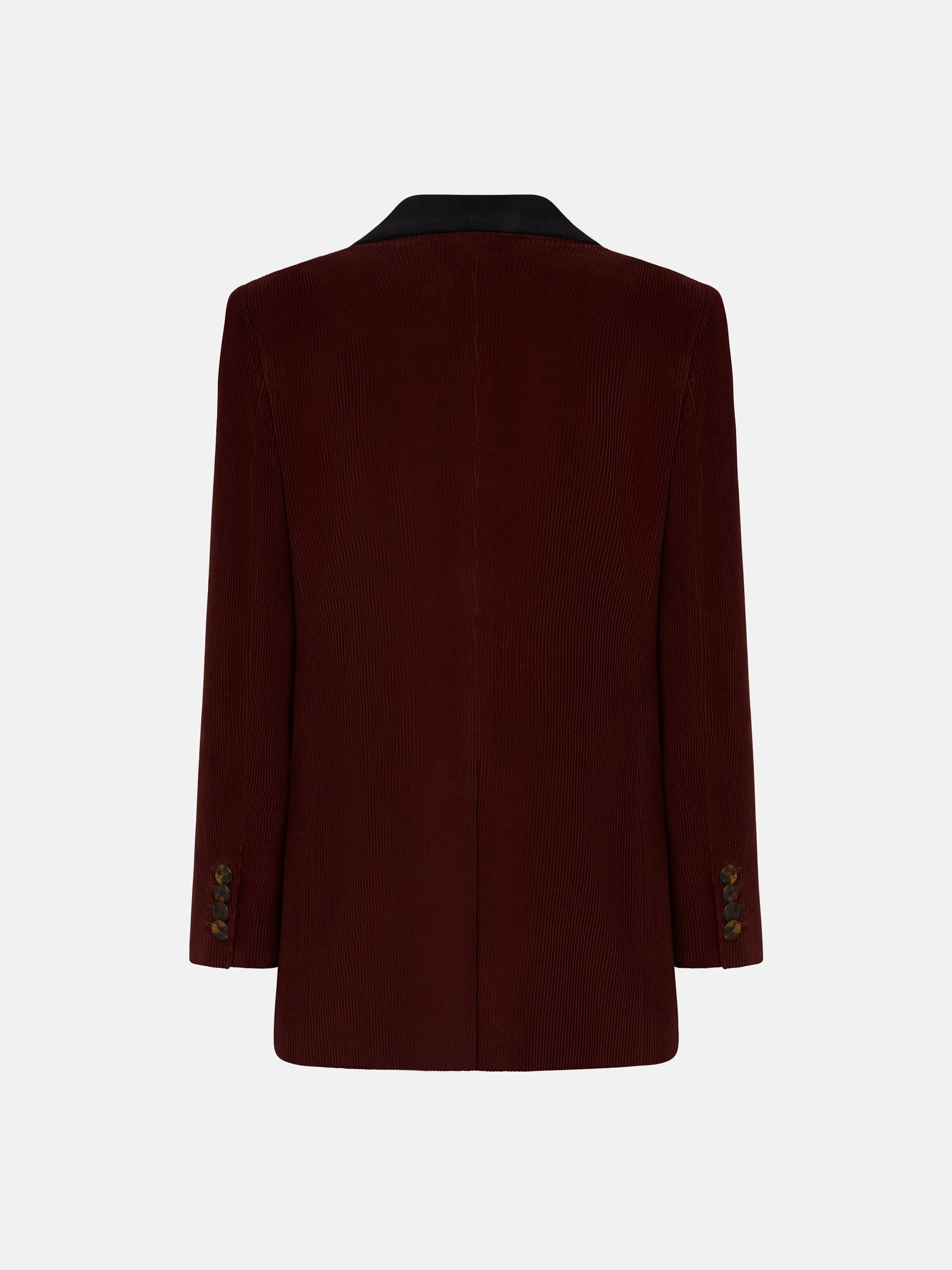 Everyday Classic Touch blazer by Blazé Milano, crafted from dark burgundy corduroy with a black velvet collar. A double-breasted jacket with a straight cut and structured shoulders. A wardrobe classic.