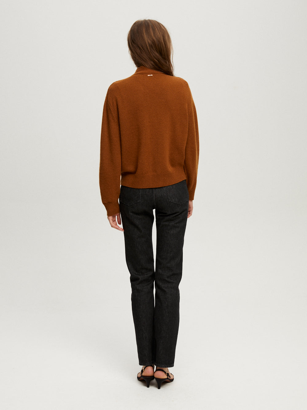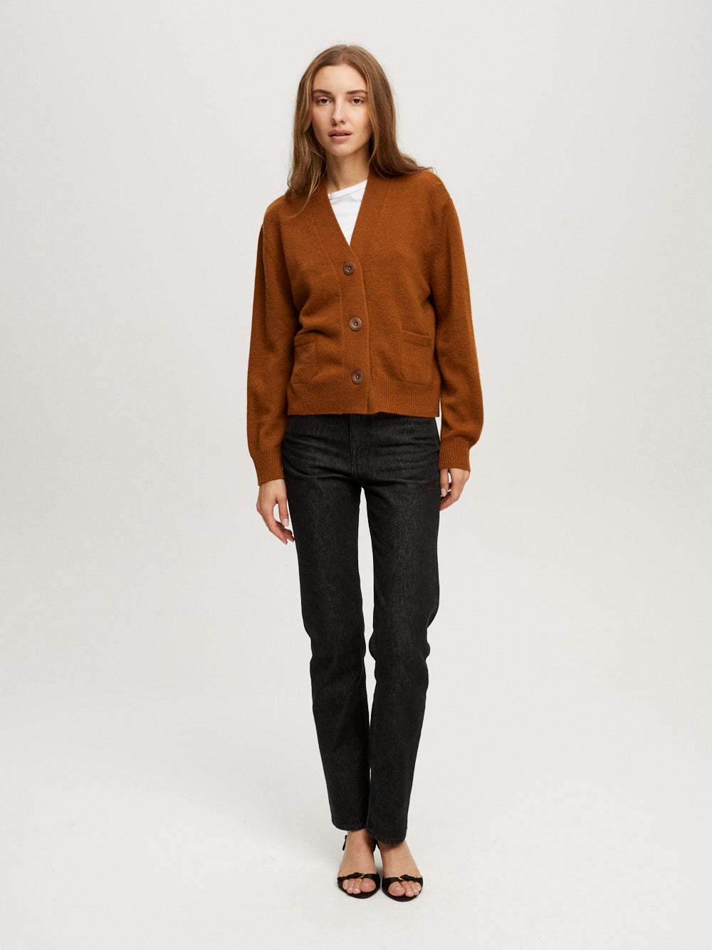 Lou Cardigan BY MARIE Collection. This cardigan is made of cashmere. This piece has patch pockets and long sleeves. This cardigan closes with buttons on the front. A gold plaque stamped with the BY MARIE logo is sewn on the back at the collar.