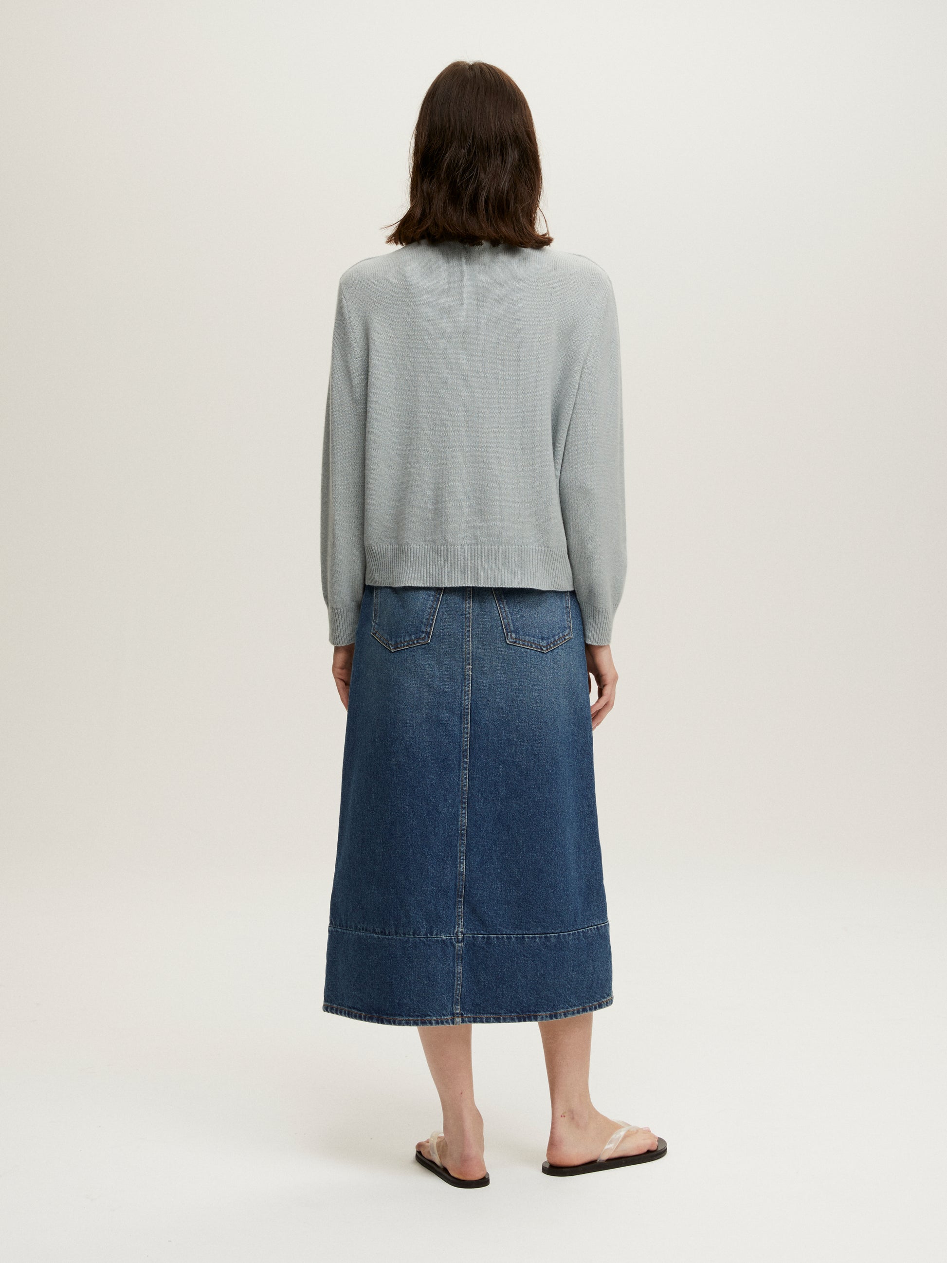 Lou Bicolor Cardigan by BY Marie Collection made from a blend of cashmere and wool in sky blue and off-white. BY MARIE cashmere is made in limited editions by hand using an antique knitting machine in a 20-year-old organization in Nepal. This company is composed primarily of women and, like us, is committed to passing on quality expertise.