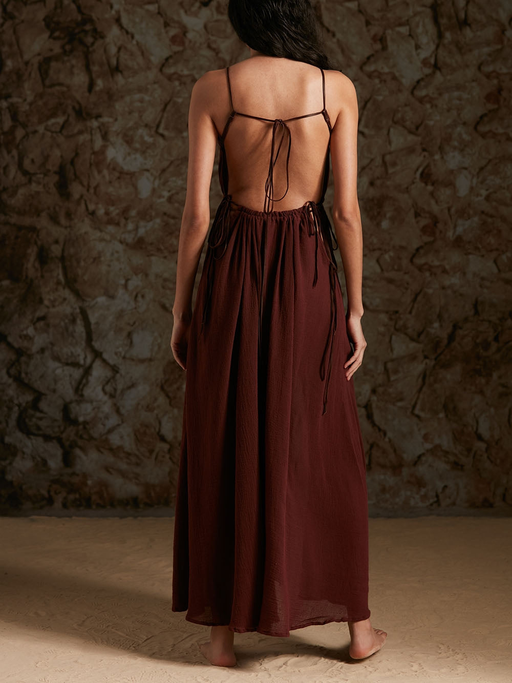 Caravana V-neck dress. This long dress is handwoven from cotton gauze. This piece has a yoked bodice with leather straps that cross at the back. Airy movement is created by two generous slits at the front. Caravana's pieces are made using a process known as 'neo-artesania', which consists of traditional Mexican craft techniques.