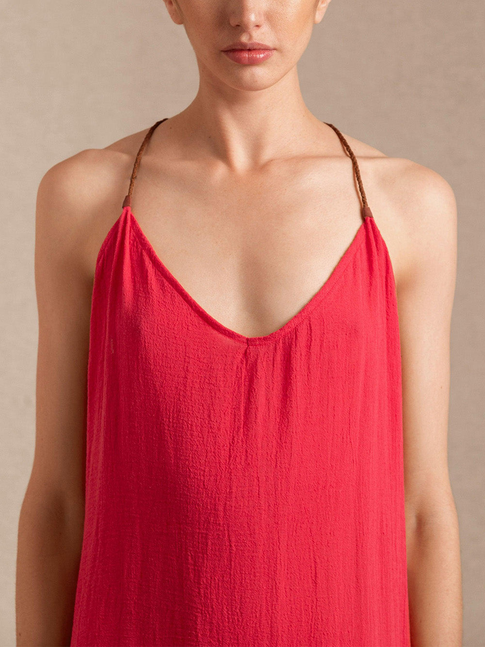 Edahi dress by Caravana, crafted from pink cotton gauze. A long, straight-cut dress with a plunging back.