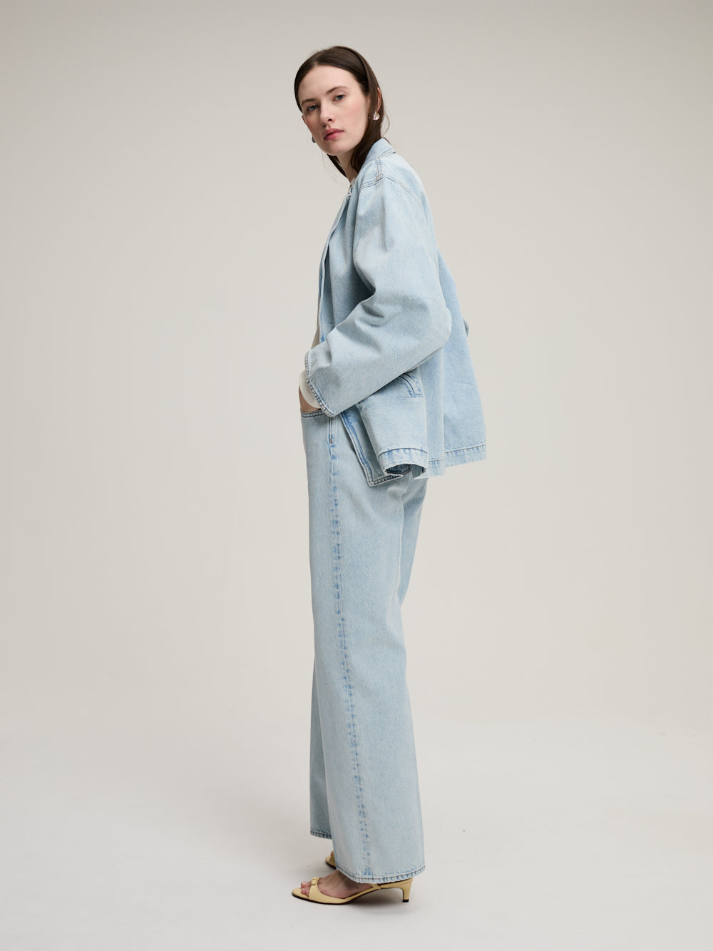 Cory Nariida Ice jacket by Blazé Milano, crafted from light blue denim. A denim jacket tailored with a blazer cut.