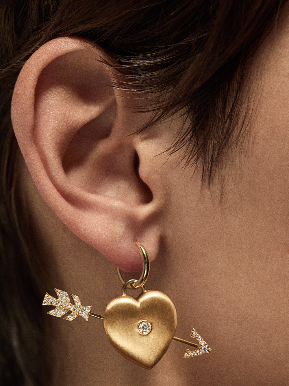 The "Coeur Percé" pendant signed Marie Lichtenberg is made in brushed 18-carat yellow gold. It takes the shape of a heart set with a white diamond in its center and pierced with an arrow set with white diamonds at its ends. Sold with a clasp and a hoop, it can be worn as a pendant or earring.