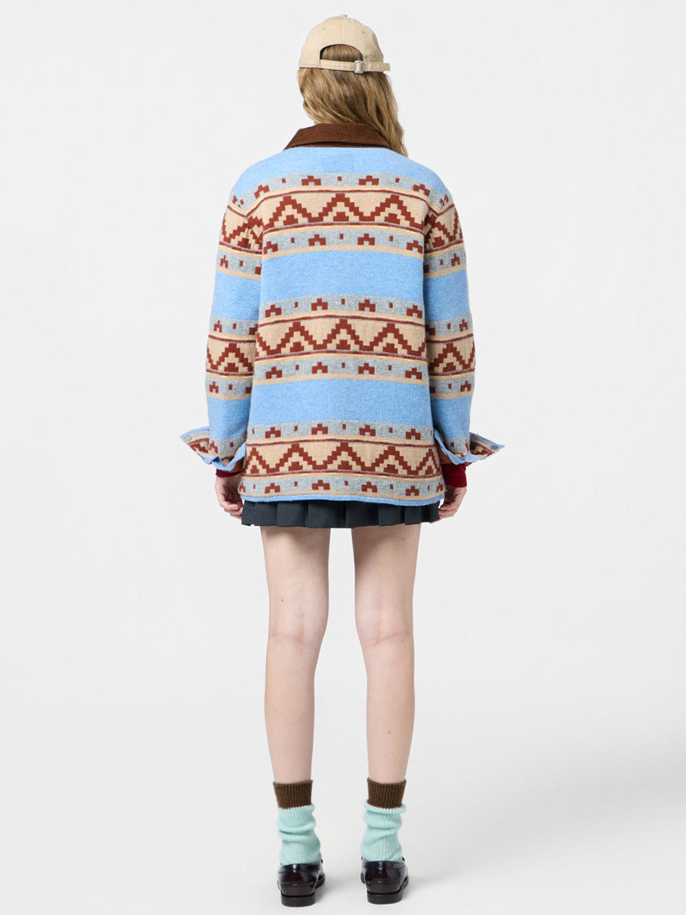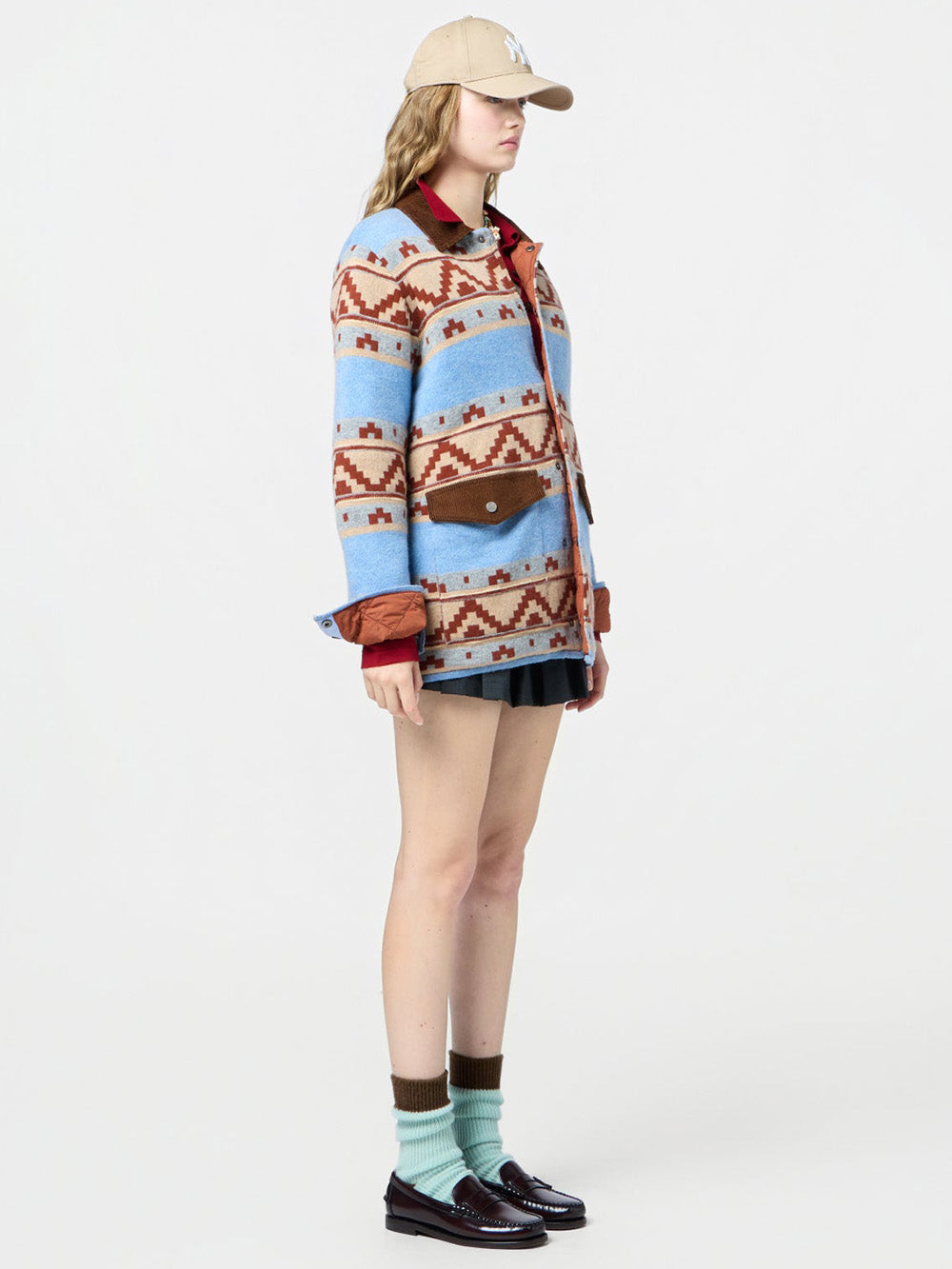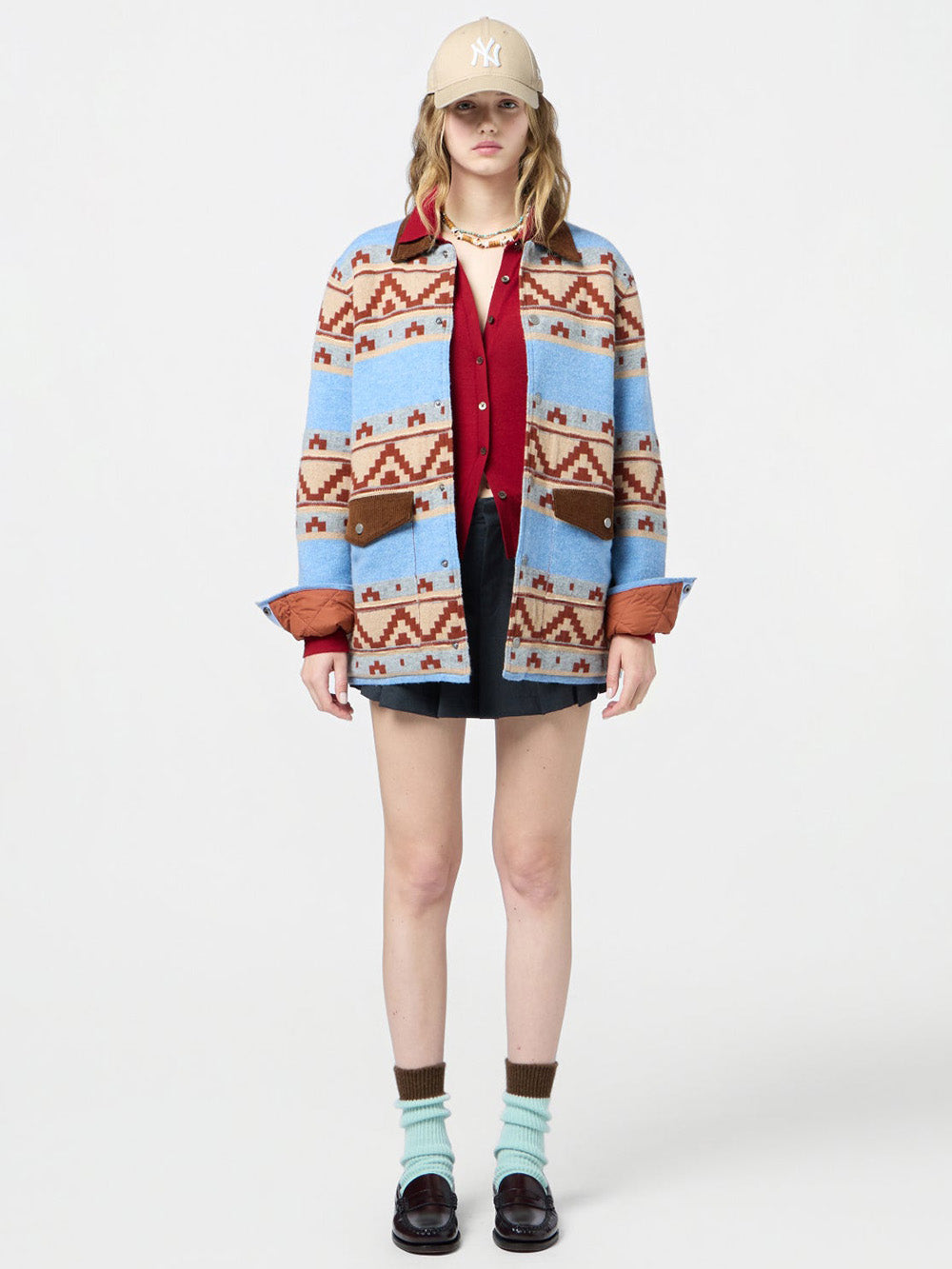Western Industry jacket by Guest In Residence made from a wool and cashmere blend with geometric patterns in shades of blue, beige and brown.