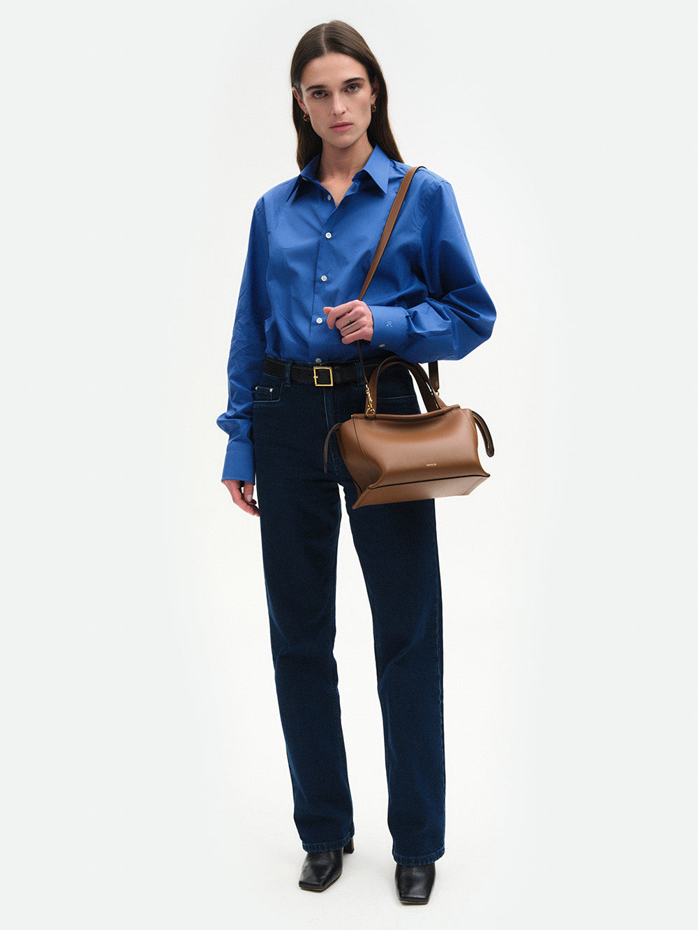 The Ida Saddle bag by Wandler is crafted from brown lambskin leather. It features double handles and a detachable shoulder strap. The interior is lined in suede, and the bag has gold-tone metal hardware.