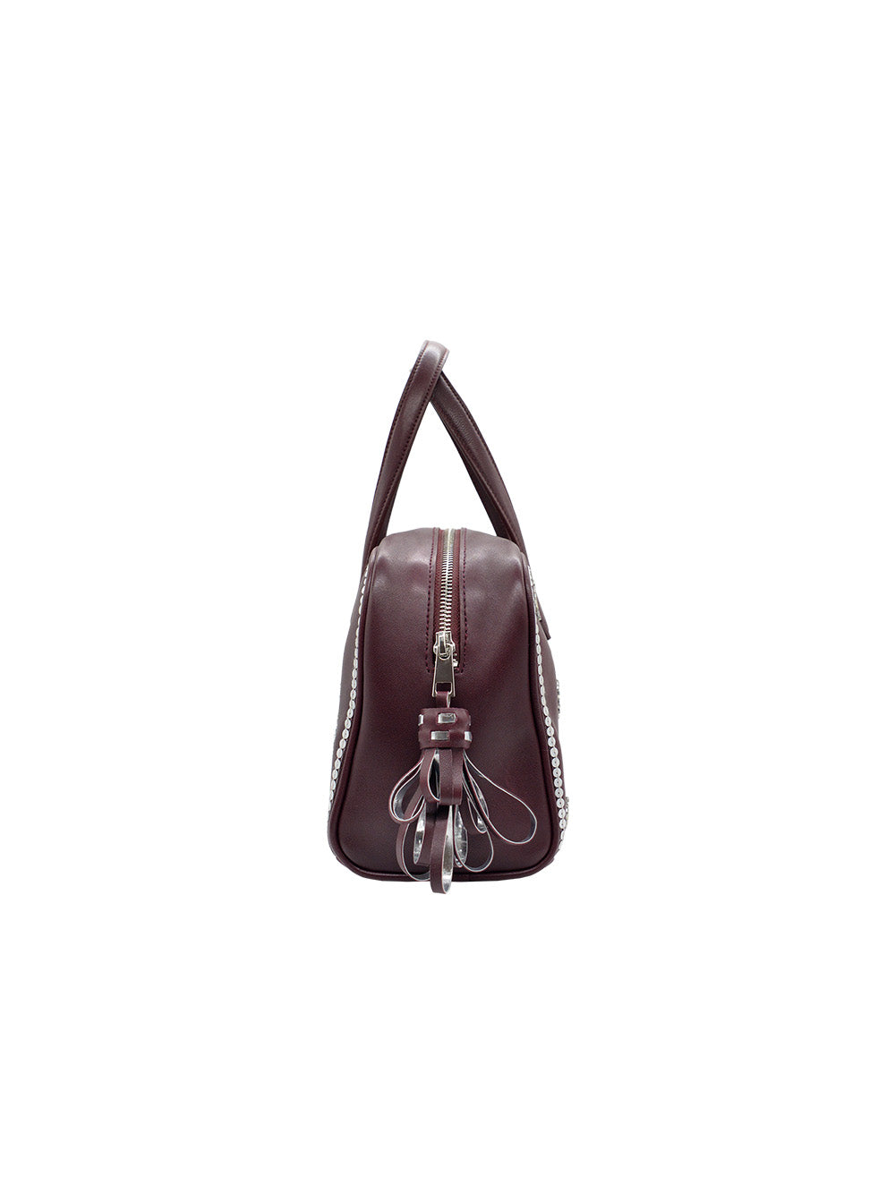 Monoki's Willie bag is crafted from burgundy leather with mother-of-pearl buttons that spiral across the front and form flowers on the back. A zippered bowling bag is finished with a leather pompom.