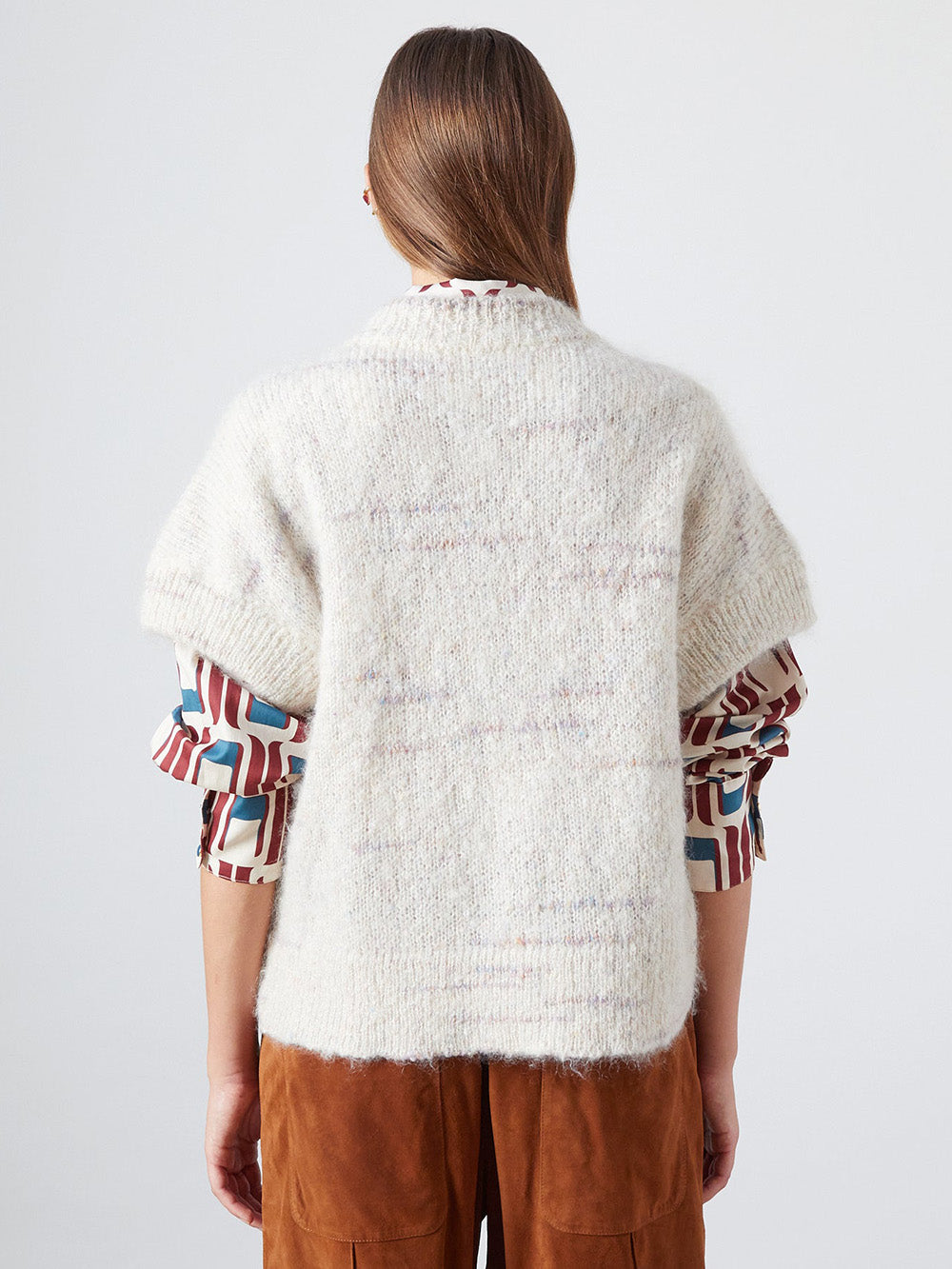 Luca Oat Melange vest by The Label Edition, made from Italian mohair knit in a mottled off-white color. A short-sleeved vest buttoned down the front with gold buttons.