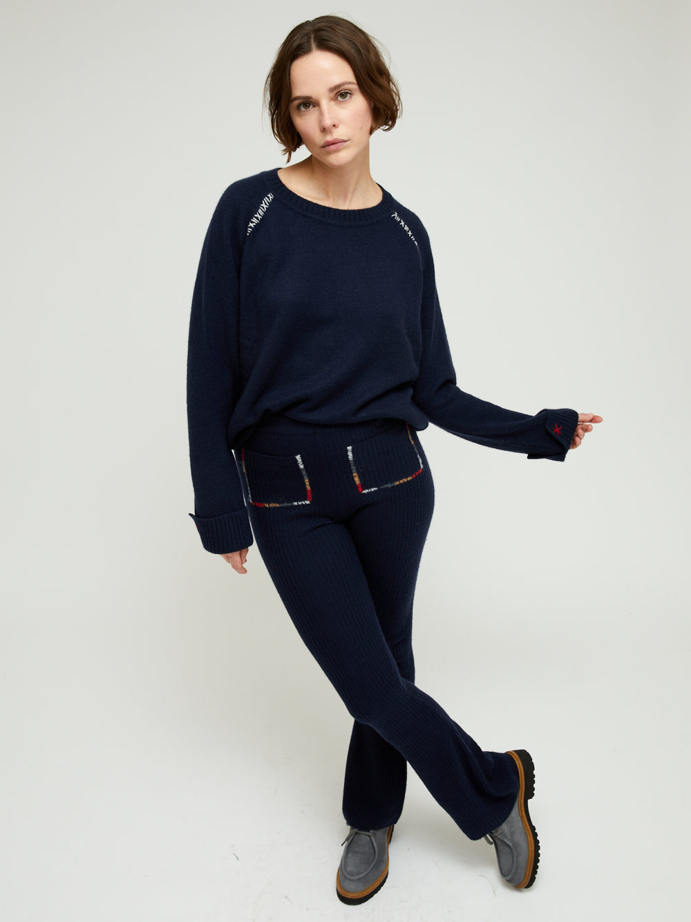 Legging signed Monoki made by hand in Navy cashmere. It has a flare cut close to the body with two front-plated pockets decorated with colorful embroidery. A comfortable and styled room.