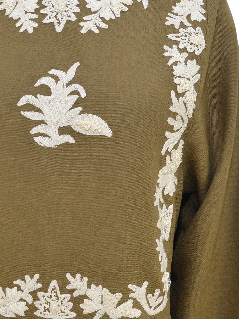 Macha dress by Monoki, made from khaki-colored silk decorated with white floral embroidery. A long dress with slightly puffed sleeves.