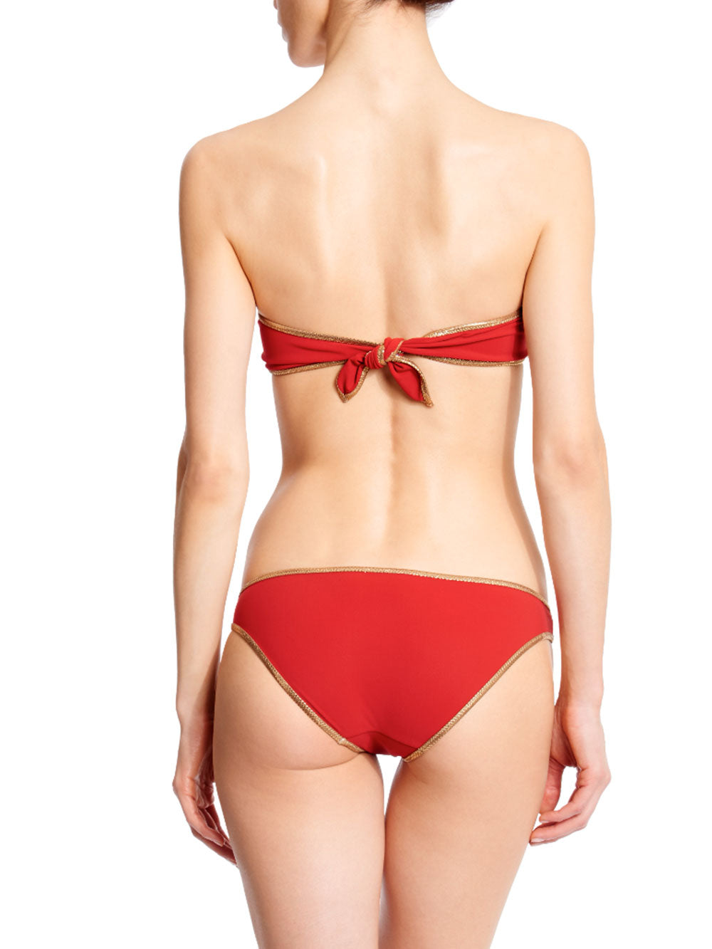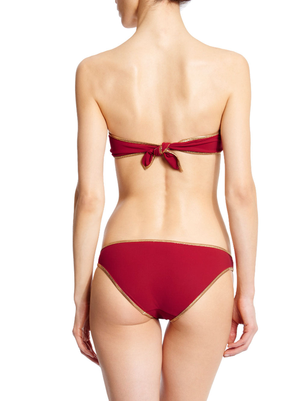 Hampton bandeau bikini swimsuit Tooshie. This two-piece bandeau swimsuit is red on one side and bordeaux on the other side. The edge is lined with a gilt lurex bias. The top provides good support for the chest and is knotted in the back.