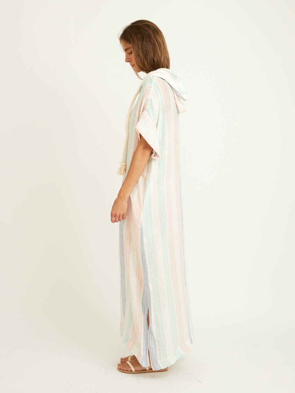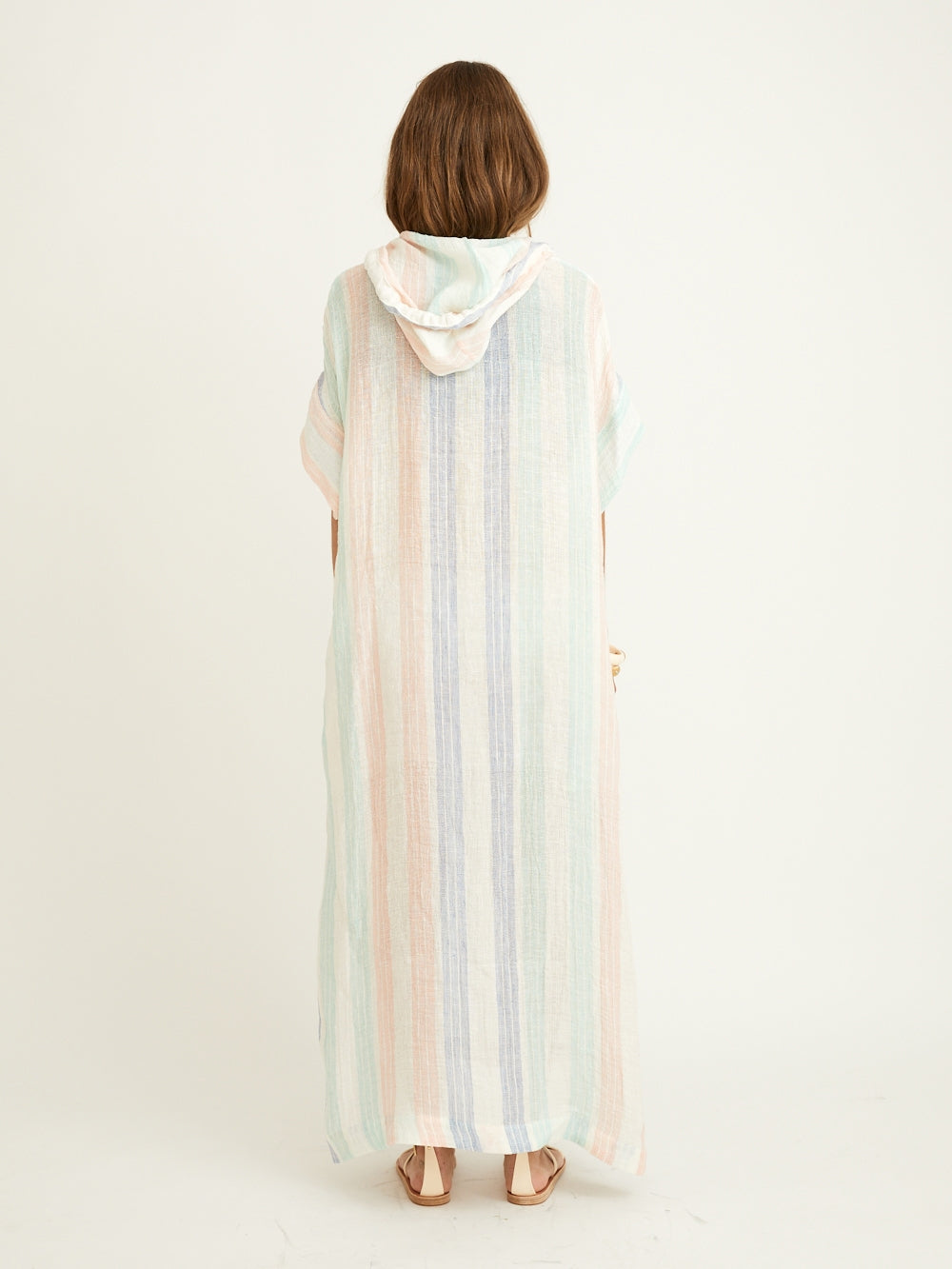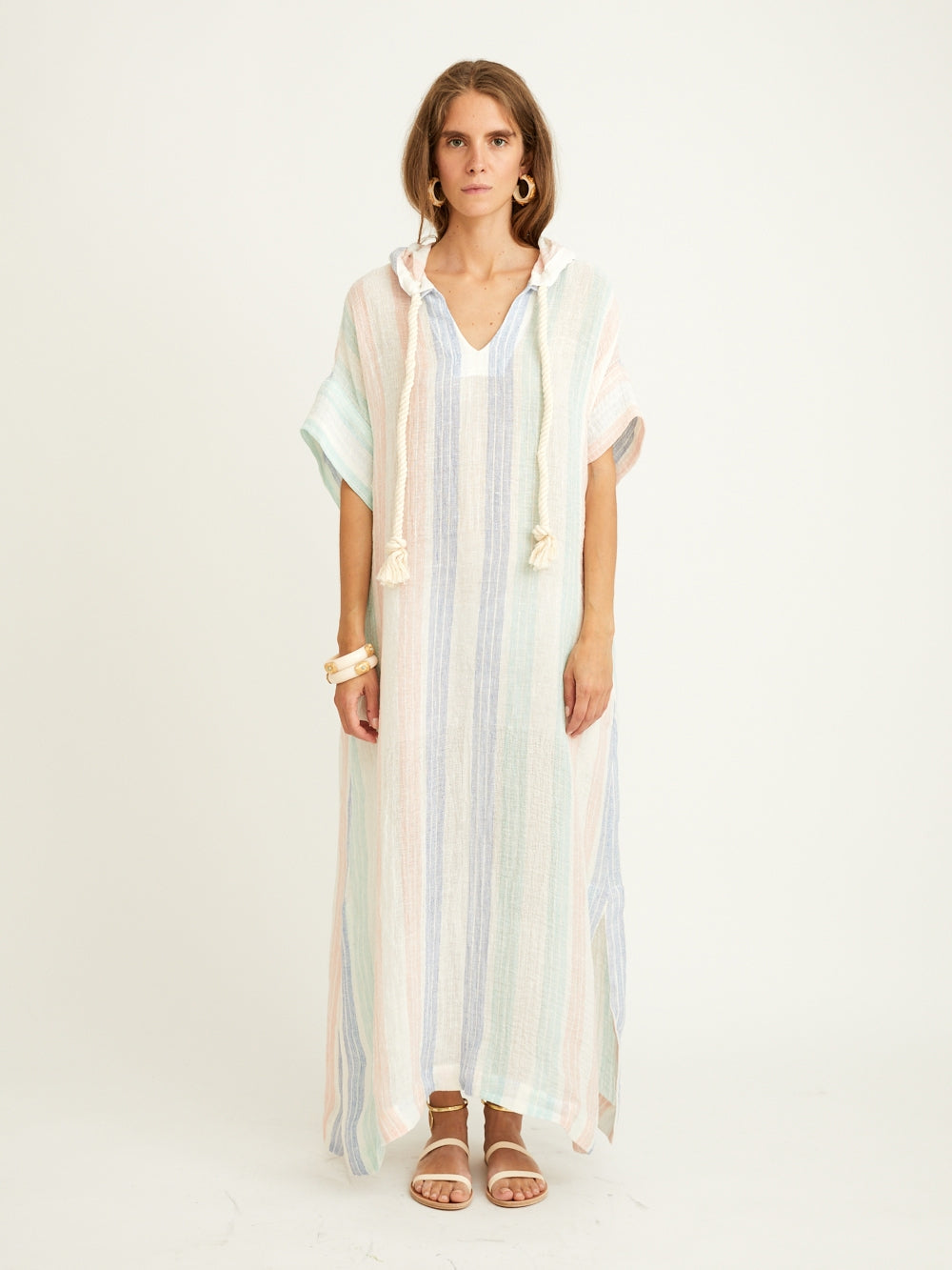 Caftan Lisa Maria Fernandez dress. This caftan has an hood and it is long. This linen piece has multicolored pastel stripes.