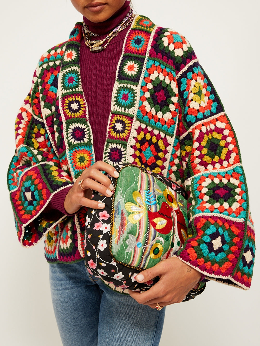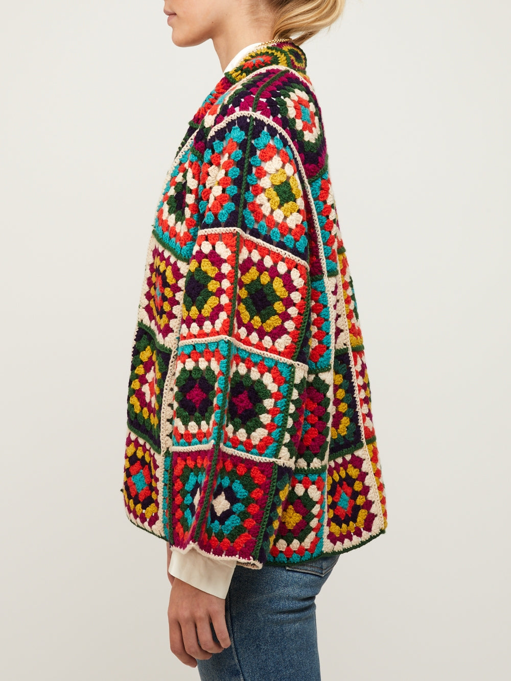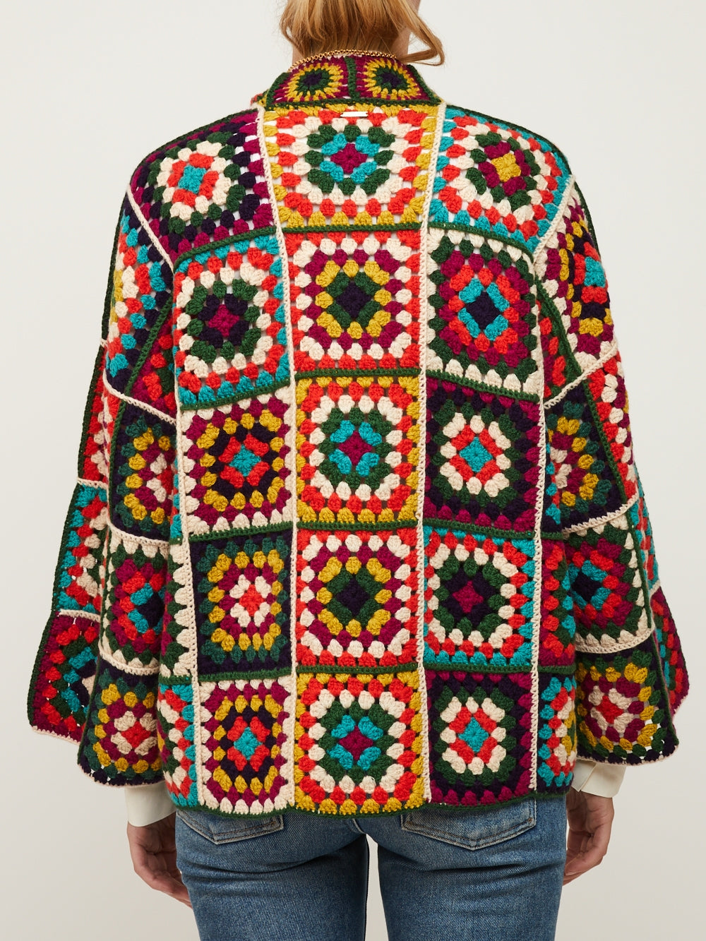 By Marie Collection Long Kimono. This crochet kimono has a straight cut, flare sleeves and is open at the front. A golden plaque stamped with the BY MARIE logo is sewn on the back at the collar.