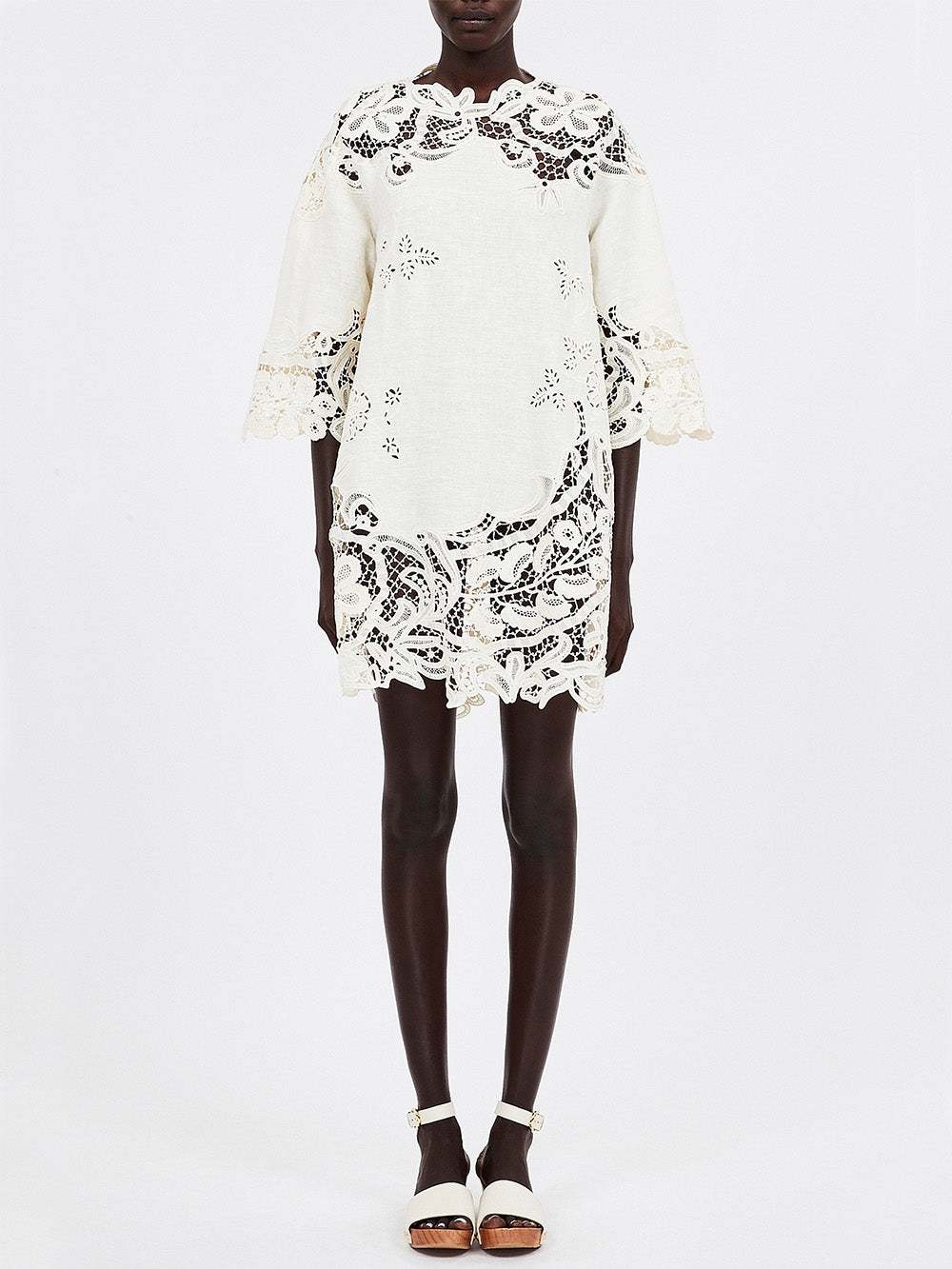 Brinna Pristine tunic by Ulla Johnson made from white linen decorated with broderie anglaise and asymmetrical cutouts. A tunic with sleeves that can be worn as a mini dress or layered over pants or a skirt.