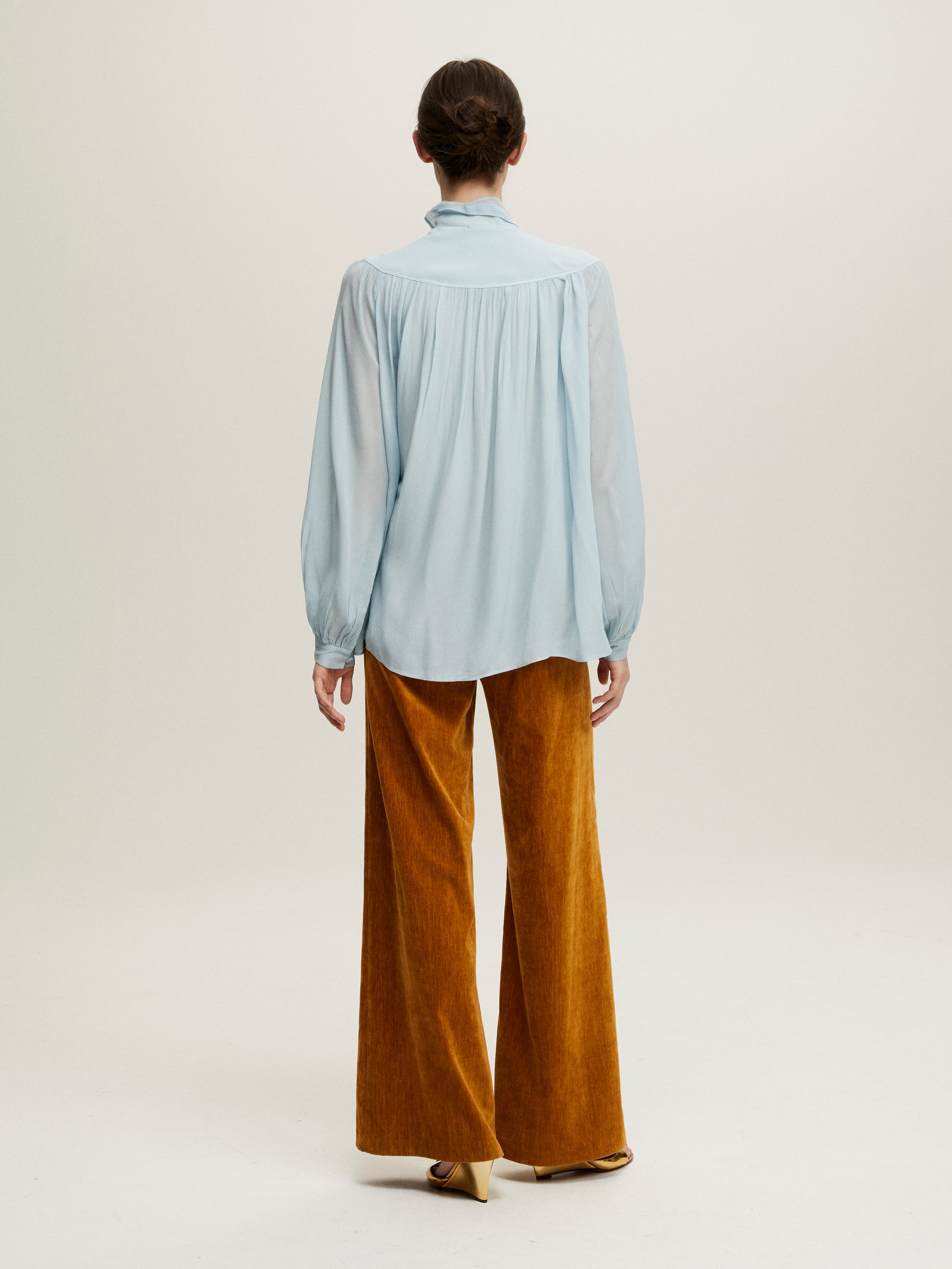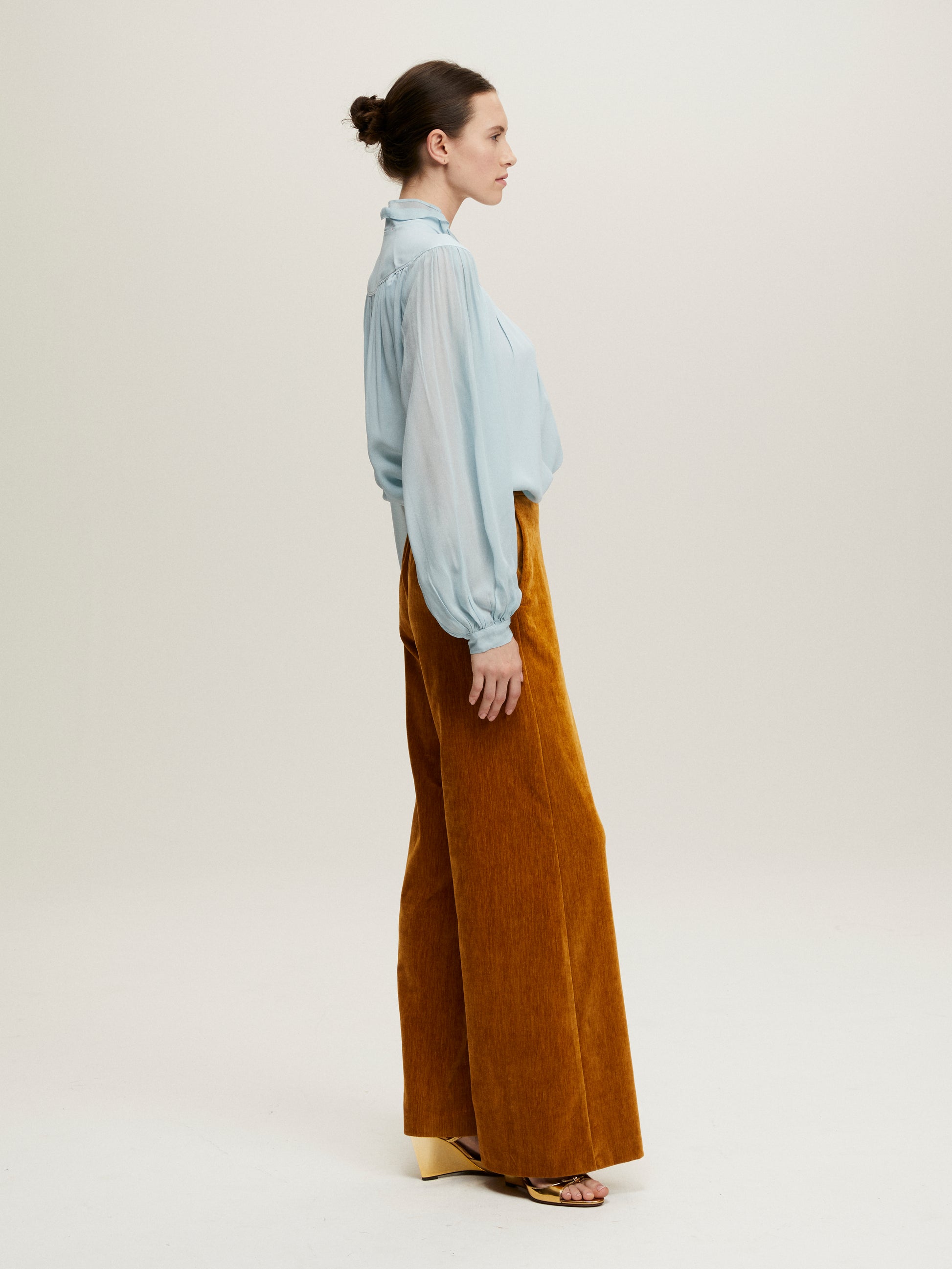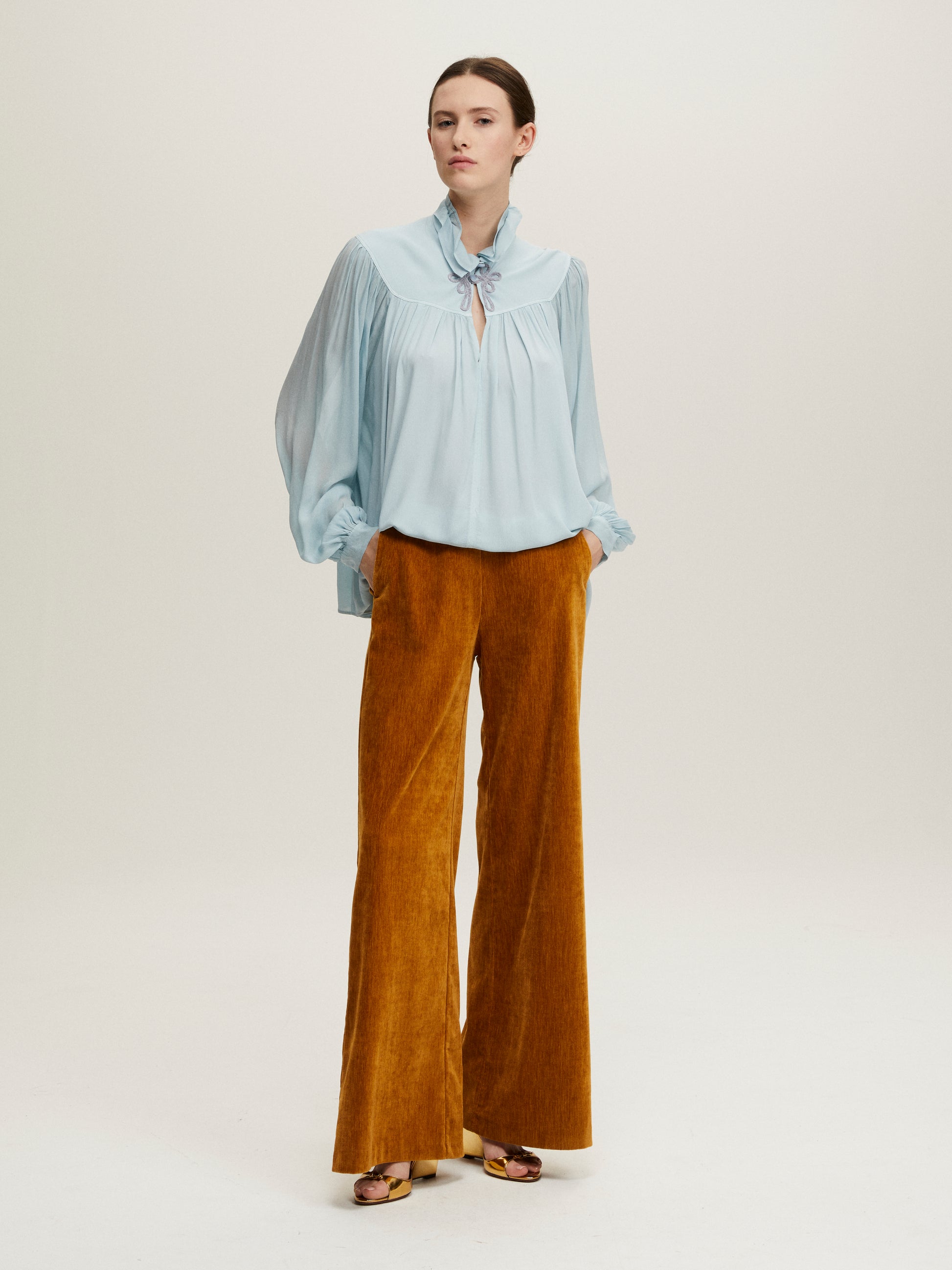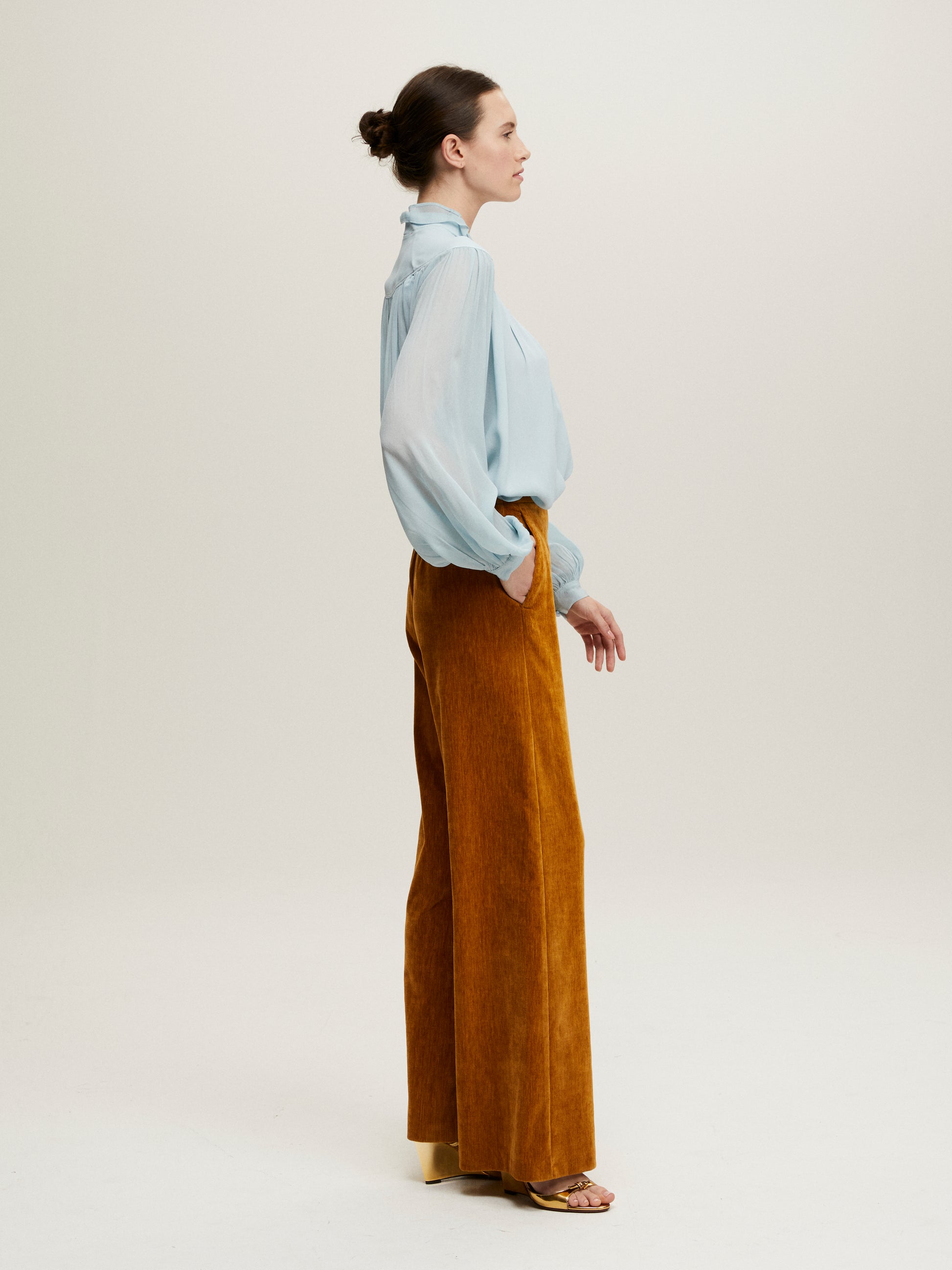 Ambra pants by Forte_Forte, crafted from a velvet fabric with amber highlights. High-waisted pants with a flared cut inspired by the 1970s.