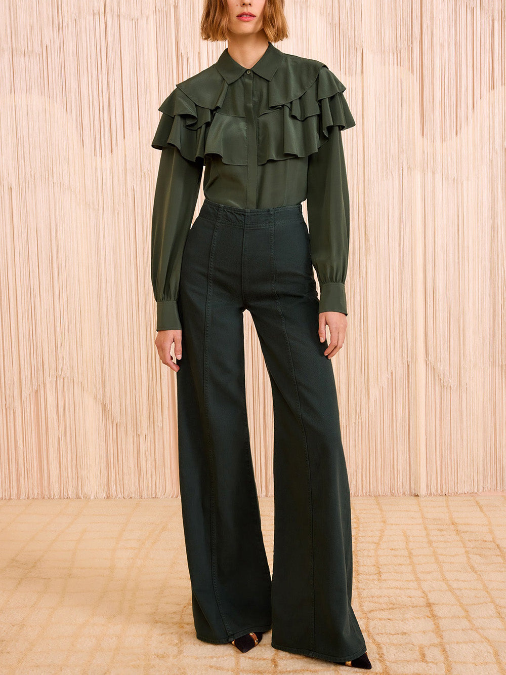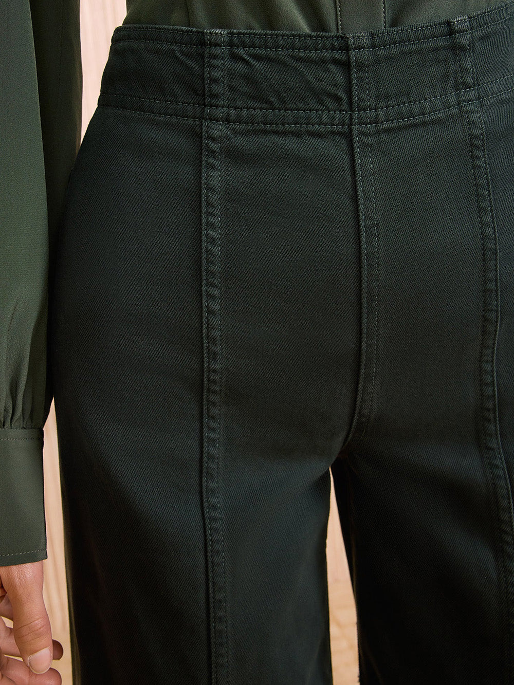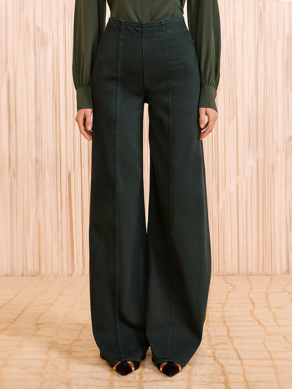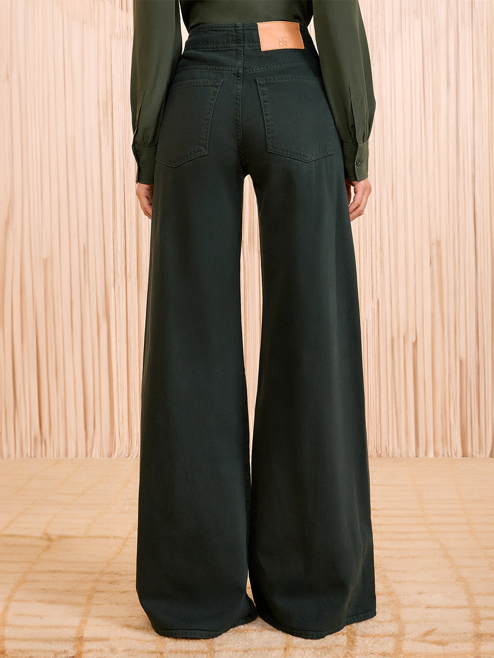 Jean The Bianca Hunter signé Ulla Johnson fabriqué à la main à Los Angeles dans une toile de jean premium de couleur vert forêt. Une jean large à la taille haute hollywoodienne pour un style chic.