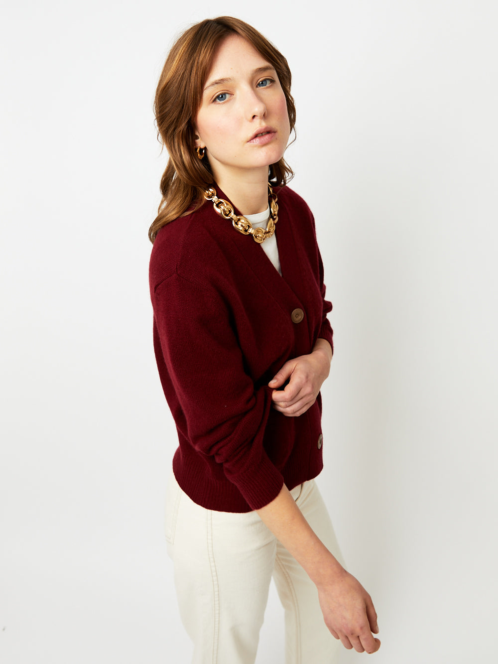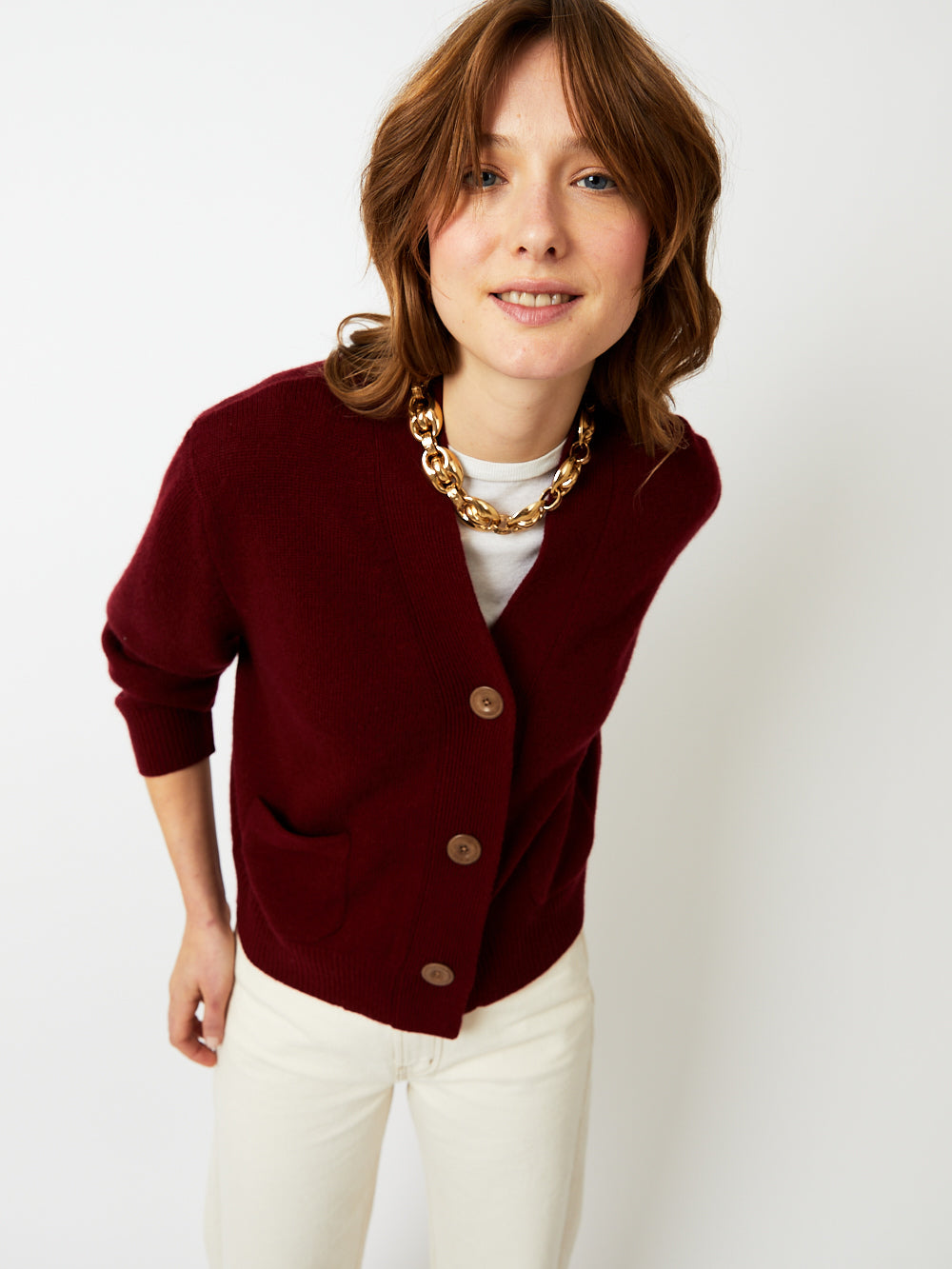 The Lou Velours BY MARIE Collection cardigan is made from cashmere and wool. BY MARIE cashmeres are made in limited series by hand and using an old knitting machine in an organization in Nepal that has existed for 20 years. This company is mainly made up of women and, like us, is committed to passing on quality know-how.