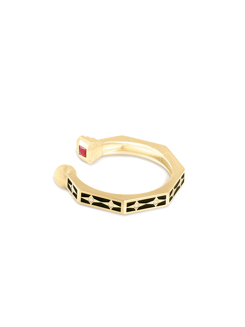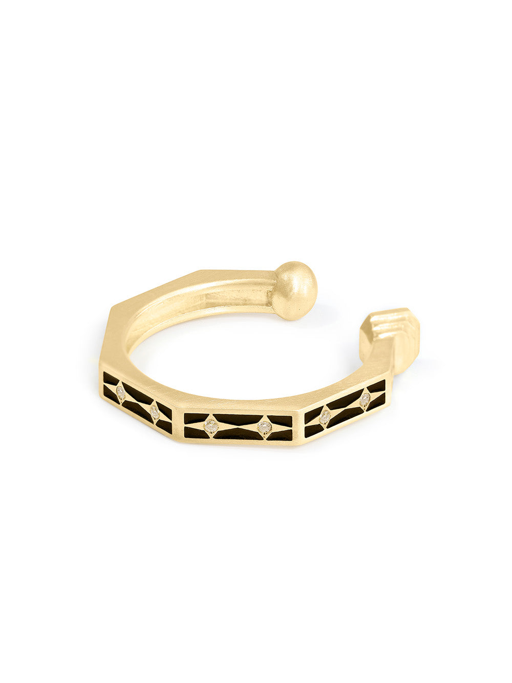 Maruccia's 8 Phalanx Stellar ring is crafted from 18-carat yellow gold, set with small diamonds in the center of gold stars. A ring with asymmetrical ends and frosted gold.