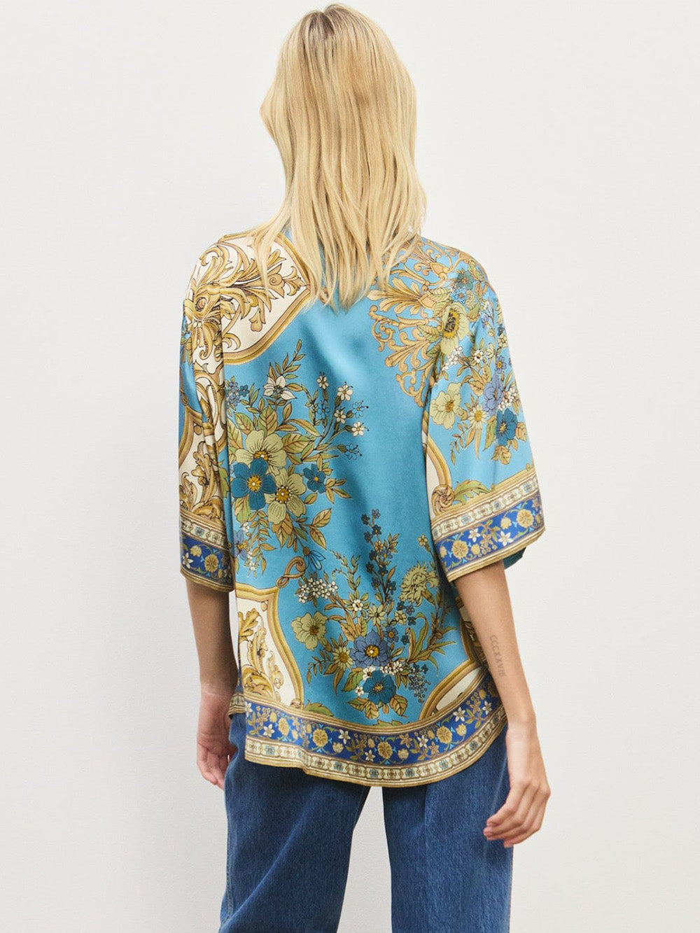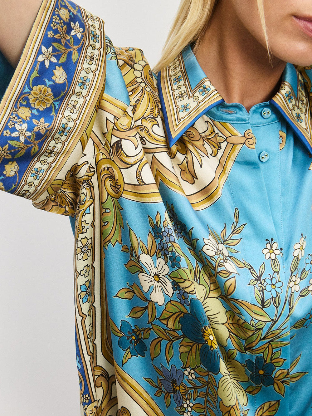 Cassie shirt by Alémais, crafted from sky blue silk satin printed with Rococo-inspired flowers and moldings. A straight-cut, oversized shirt.