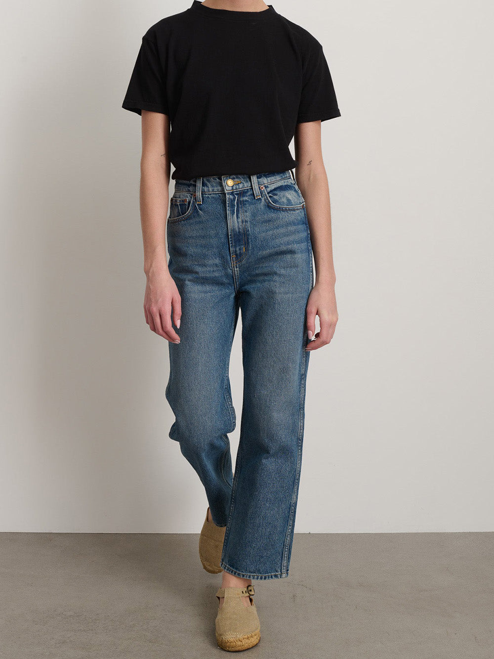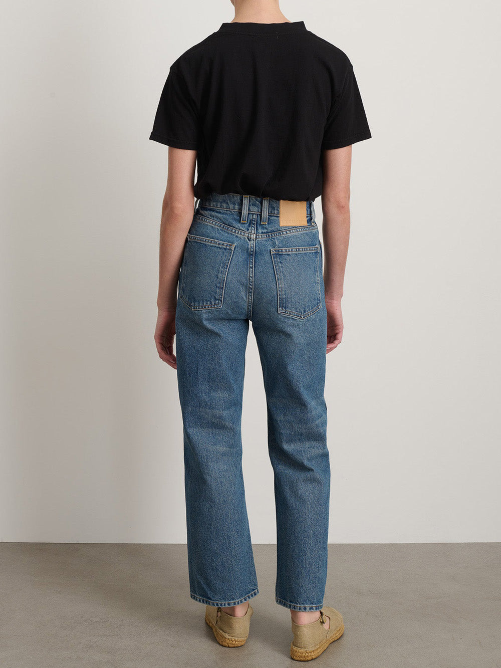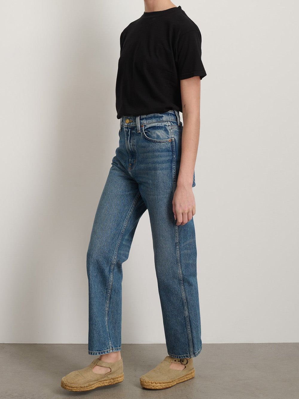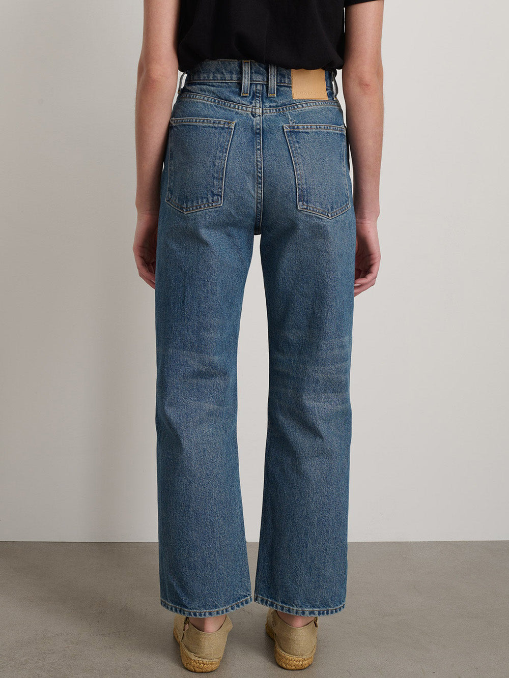 The Vista Blue Plein jeans from BSIDES, in blue denim, have a straight fit with a high waist, slightly flared legs and cropped ankles. This piece is designed in New York and responsibly made in Los Angeles.