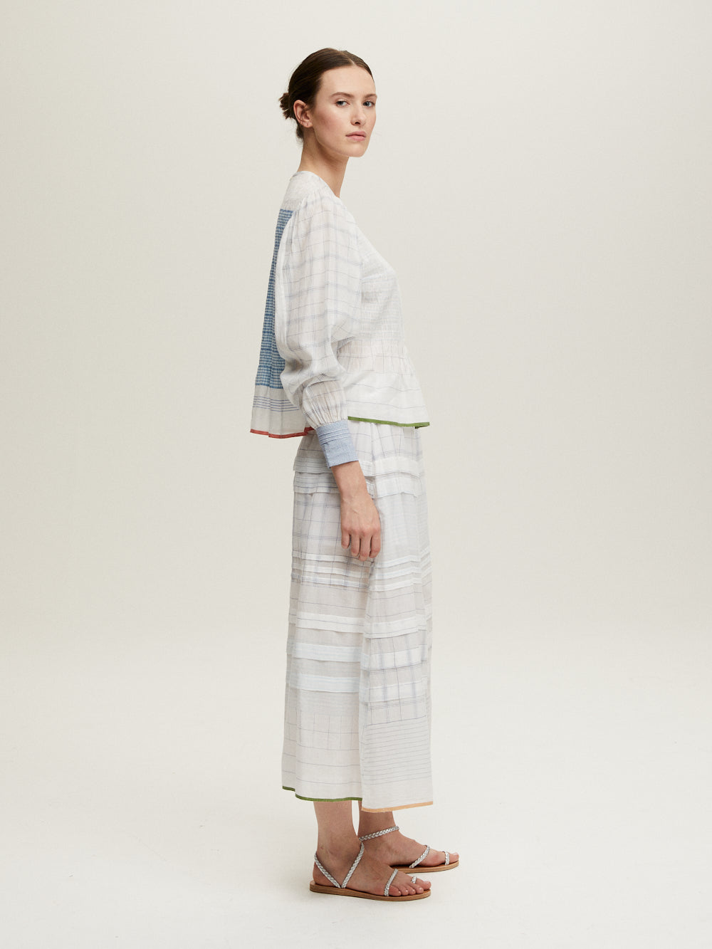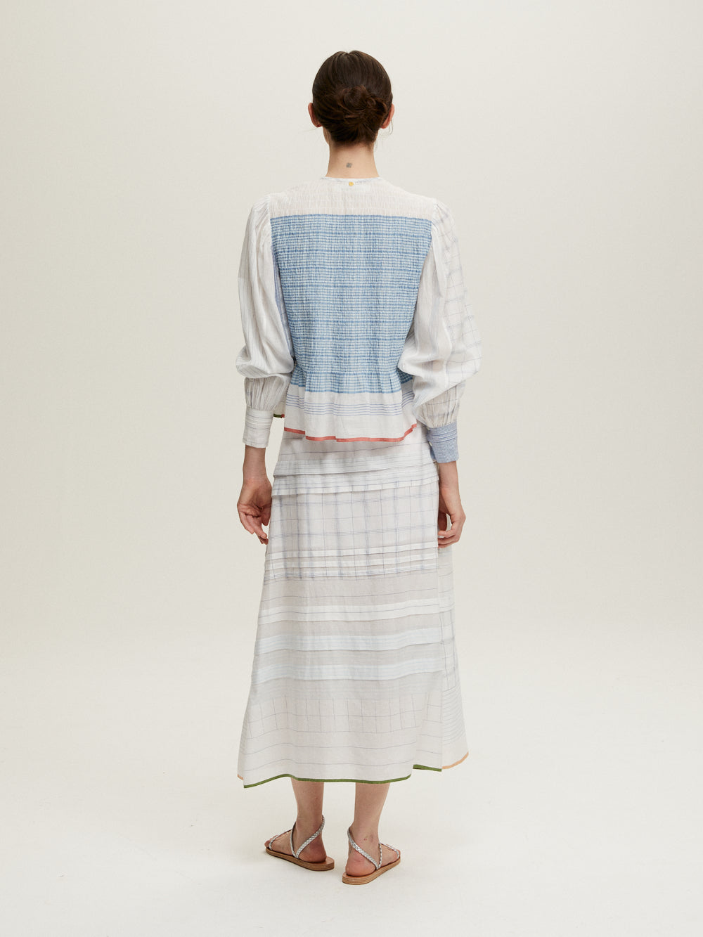 Chloé Jamdani skirt by Jane Gustavsson crafted from white organic cotton with stripes and grids in varying shades of blue. A long, flared skirt with a button-front closure.