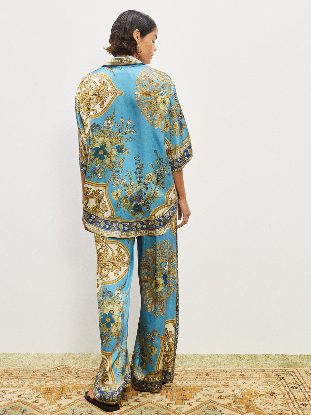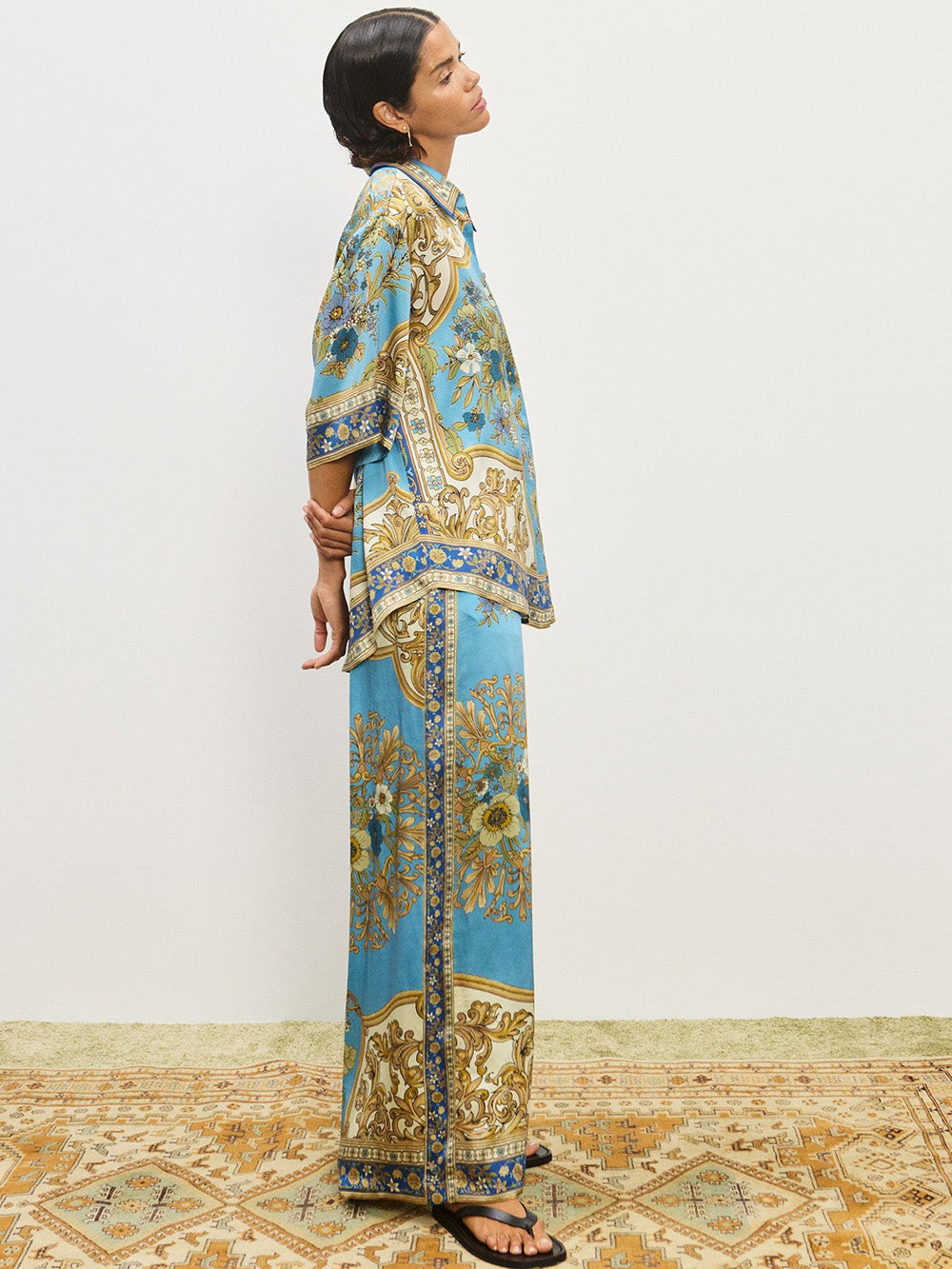 Cassie pants by Alémais, crafted from sky blue silk satin printed with Rococo-inspired flowers and moldings. Wide-legged pants with a straight cut.