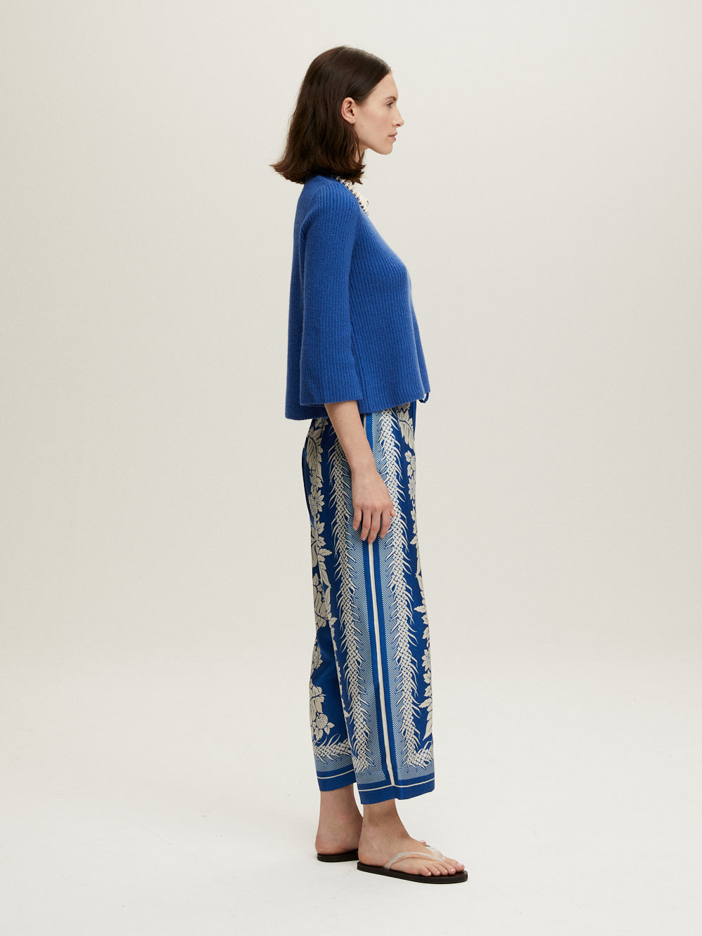 Lamour BY Marie pants made from navy blue silk twill with white placement prints. A collection designed by Marie Gas and made in a prestigious Italian workshop specializing in placement prints. Straight-cut pants that fall at the ankles.