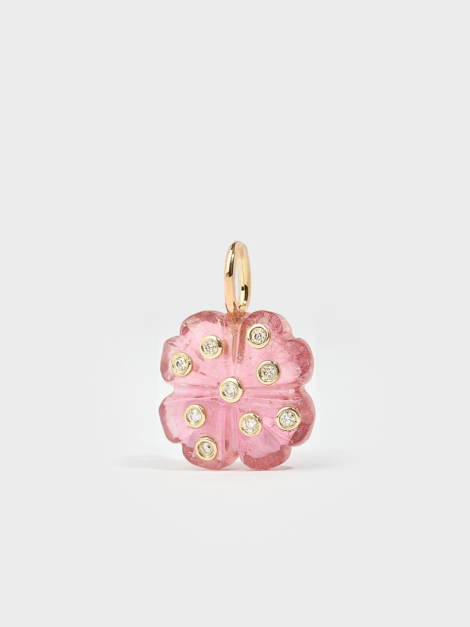 Tamara Taichman's signature clover pendant crafted from pink tourmaline set with diamonds, mounted on a 9-carat yellow gold bail.