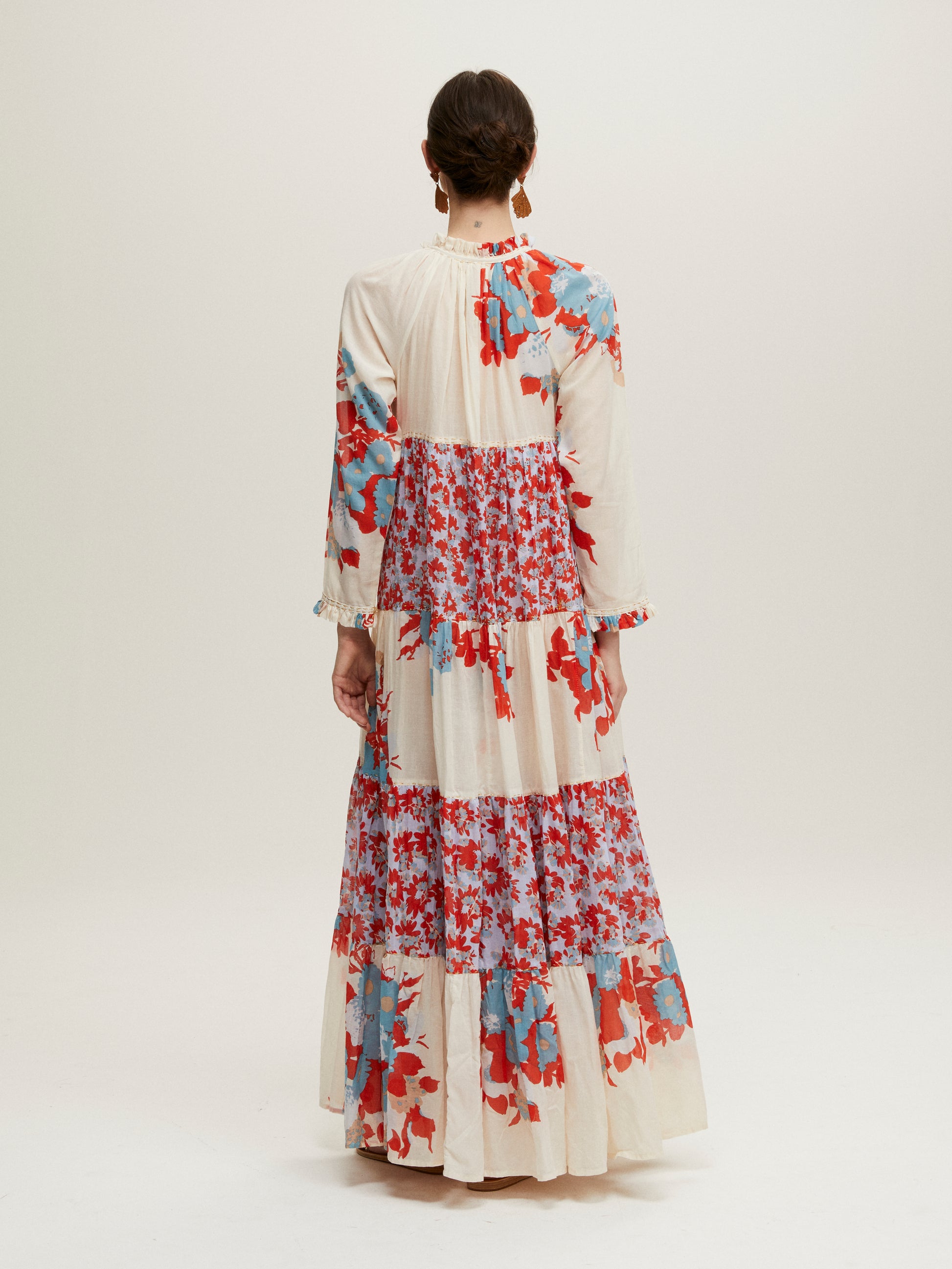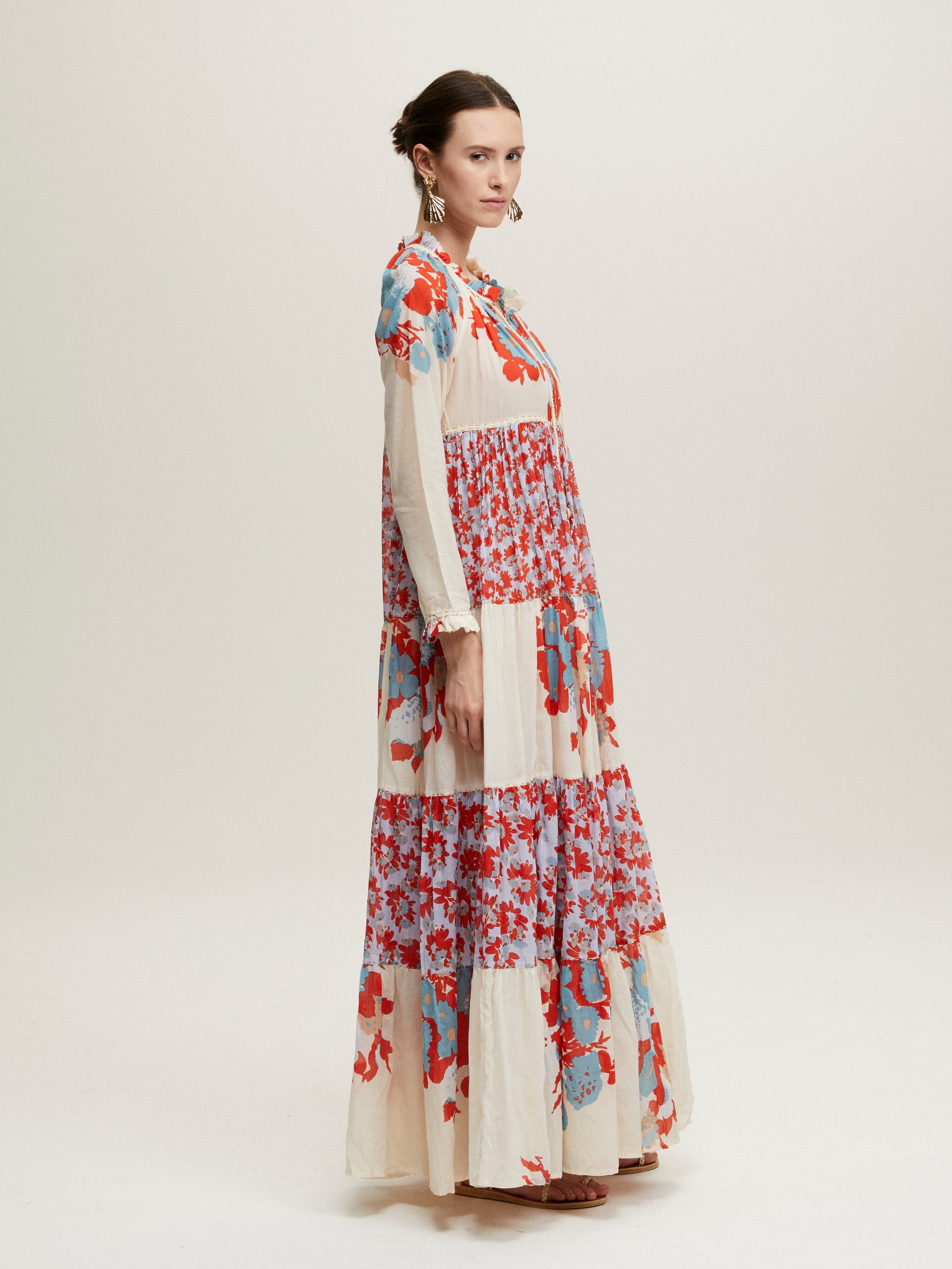 Hippy maxi dress by Yvonne S, crafted from lightweight cotton voile with a hand-printed floral design in shades of red and blue. A long dress with a loose, flared fit.