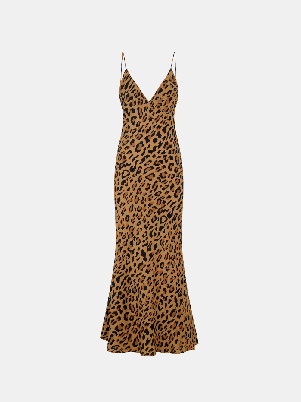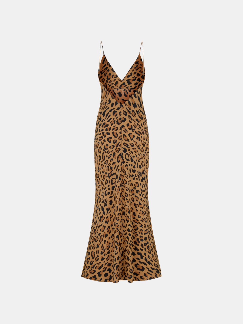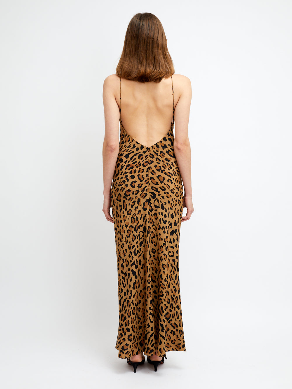 Simba Manipur dress by Blazé Milano made from leopard print silk. A long, lingerie-style dress with an irresistible plunging back.